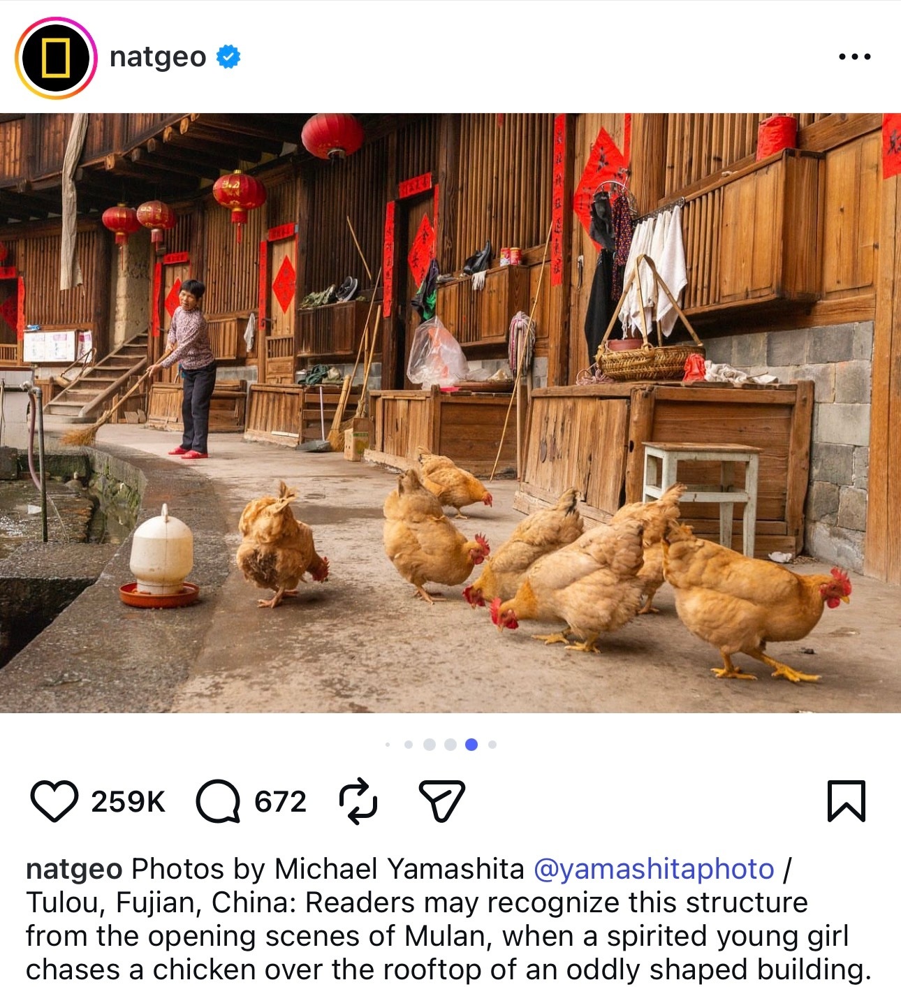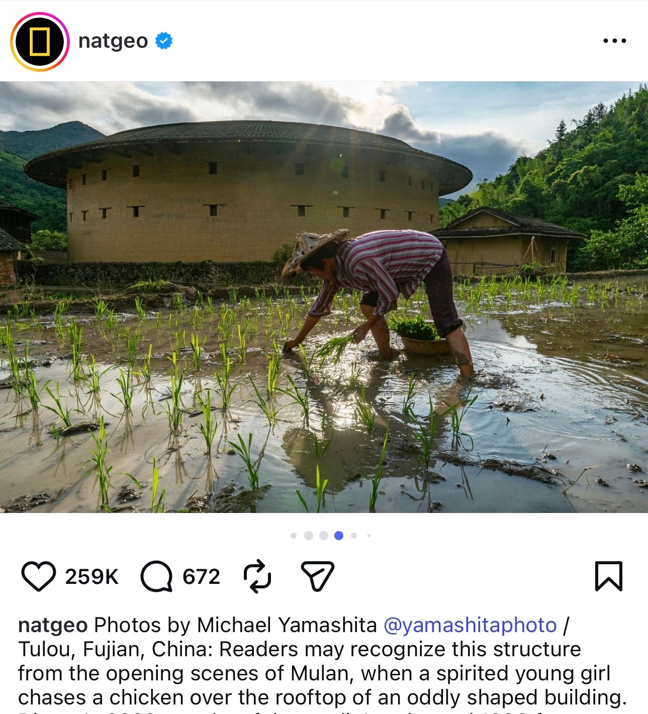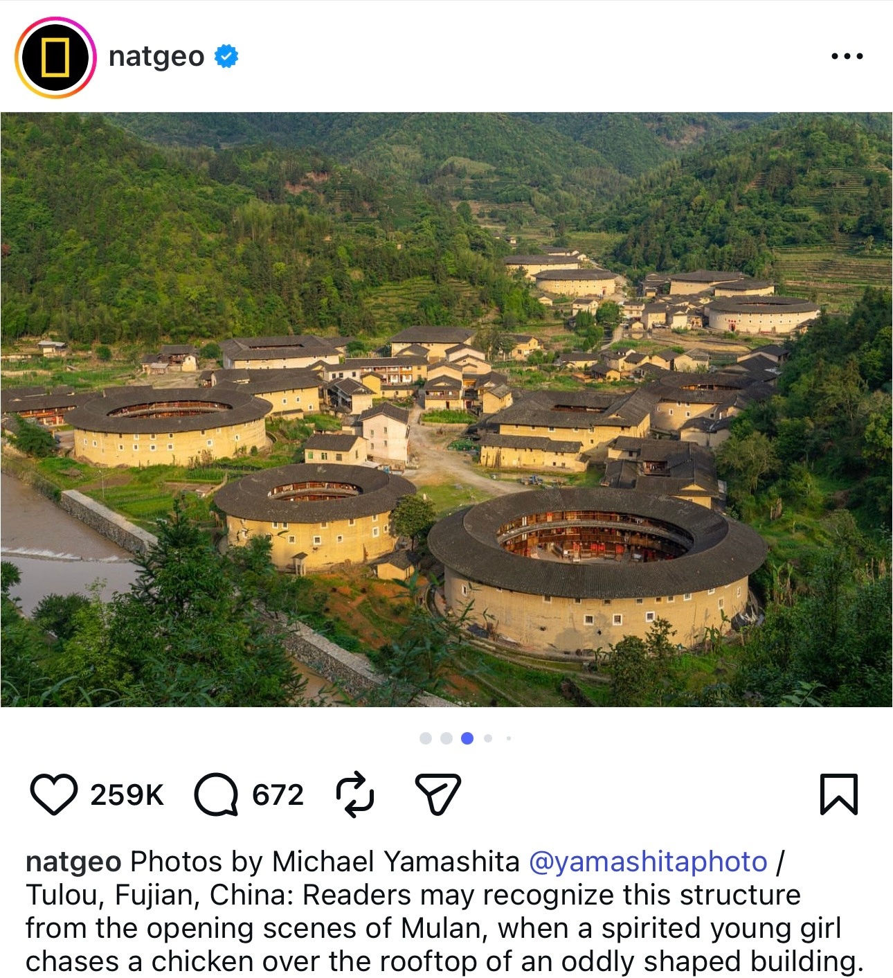 全球最有影响力的自然与地理科学杂志National Geographic国家地理杂志官方Ins在刘亦菲《花木兰》上映时还对电影里出现的福建土楼进行过介绍,还发布了摄影师曾在中国福建拍摄到的土楼照片,天仙全球大爆作品的力量花木兰