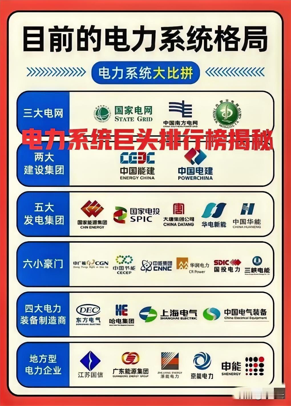 万万想不到!当前国内电力系统央国企地位汇总揭秘!三大电网,两大电力建设集团,五大发电厂,六小豪门贵族,四大电力设备制造商,若干地方电力土豪玩家你!八仙过海,各显神通!你觉得这些企业有哪些优势?哪些企业薪资待遇比较优越?欢迎评论区留言交流讨论相关话题![点亮平安灯][点亮平安灯][烟花][烟花] 欢迎关注@叮咚云 将优先为粉丝职业规划指导,1对1咨询是付费服务,为你定制最适合的就业择业方案!欢迎留言交流讨论。[来看我][来看我] 免责声明:图片来自网络,仅供参考! 央国企求职 央国企招聘 央国企求职招聘国企待遇