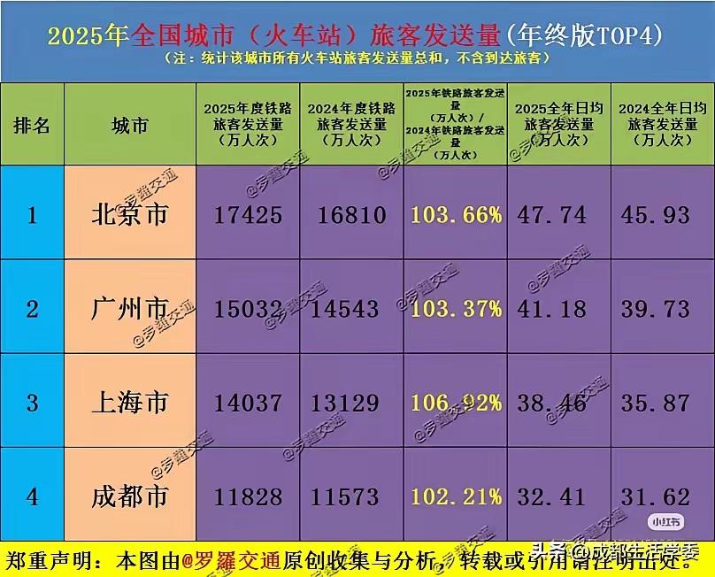 成都铁路客流跃居全国第四:枢纽力量闪耀,中西部门户再展新姿 2025年全国城市火车站旅客发送量年终数据出炉,成都以全年11828万人次的铁路旅客发送量,稳居全国第四。这一成绩不仅印证了成都作为国家战略腹地核心承载地和西部综合交通枢纽的强劲吸引力,更折射出这座“雪山下的公园城市”日益活跃的经济脉搏与开放活力,名副其实的中西部第一大城,内陆之王! 数据背后的“成都速度” 成都2025年铁路旅客发送量较2024年的11573万人次增长102.21%,日均发送旅客约32.41万人次。在北上广之后稳居第四,标志着成都已连续多年稳居全国铁路客流第一方阵。 这一数据的含金量不仅仅在于“第四”的排位,更在于其持续而稳定的增长曲线。在高铁网络不断加密、城市轨道交通持续延伸的背景下,成都铁路旅客发送量始终保持稳健上扬,这既是城市能级提升的直接体现,也是人口集聚、经济活跃的生动注脚。 未来可期:从“第四”出发,航空、地铁、铁路全面进入全国前四,北上广深成的一线城市格局已经确定。 成都航空客流量全国第三,突破9000万,地铁突破1000万,全国第五,铁路又突破到11828万,全国第四,提现了成都的经济活力和人口活力,标志着成都成为内陆第一中心城市地位不确立,成都未来可期。 成都从西南内陆到开放前沿,成都正以更加自信、从容的步伐,沿着铁轨绘就的脉络,走向全国,联通世界。