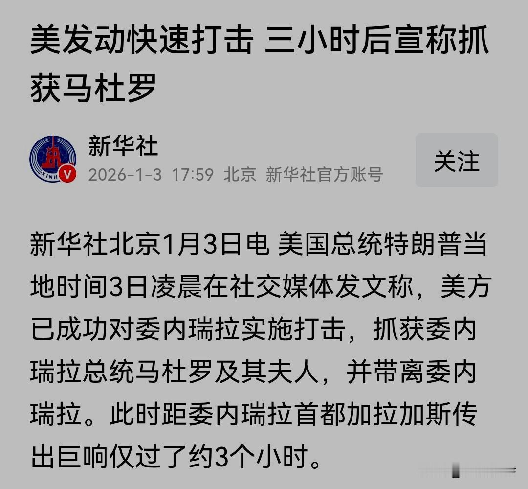 美方已成功对委内瑞拉实施打击,抓获了总统马杜罗及其夫人并带离委内瑞拉,此时距委内瑞拉首都加拉加斯传出巨响仅过了约3小时。为什么美军在委内瑞拉得手如此容易?这只能说明两个问题:第一,美帝的军事、情报系统确实发达;第二,马杜罗失去人心,没有人愿意奋不顾身真的保护他,包括委内瑞拉军队和总统卫队,也许他们没有抵抗,即便抵抗了,可能只是做做样子而已。 怎样界定美国对委内瑞拉采取的这次行动呢?国家主权属于大多数普通老百姓,所以,应该看当地的主流民意。如果老百姓坚决反抗,就是侵略;如果老百姓坚决欢迎,美国这个国际警察就是执法。