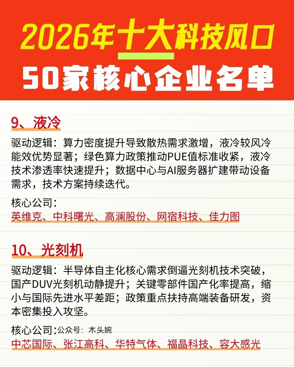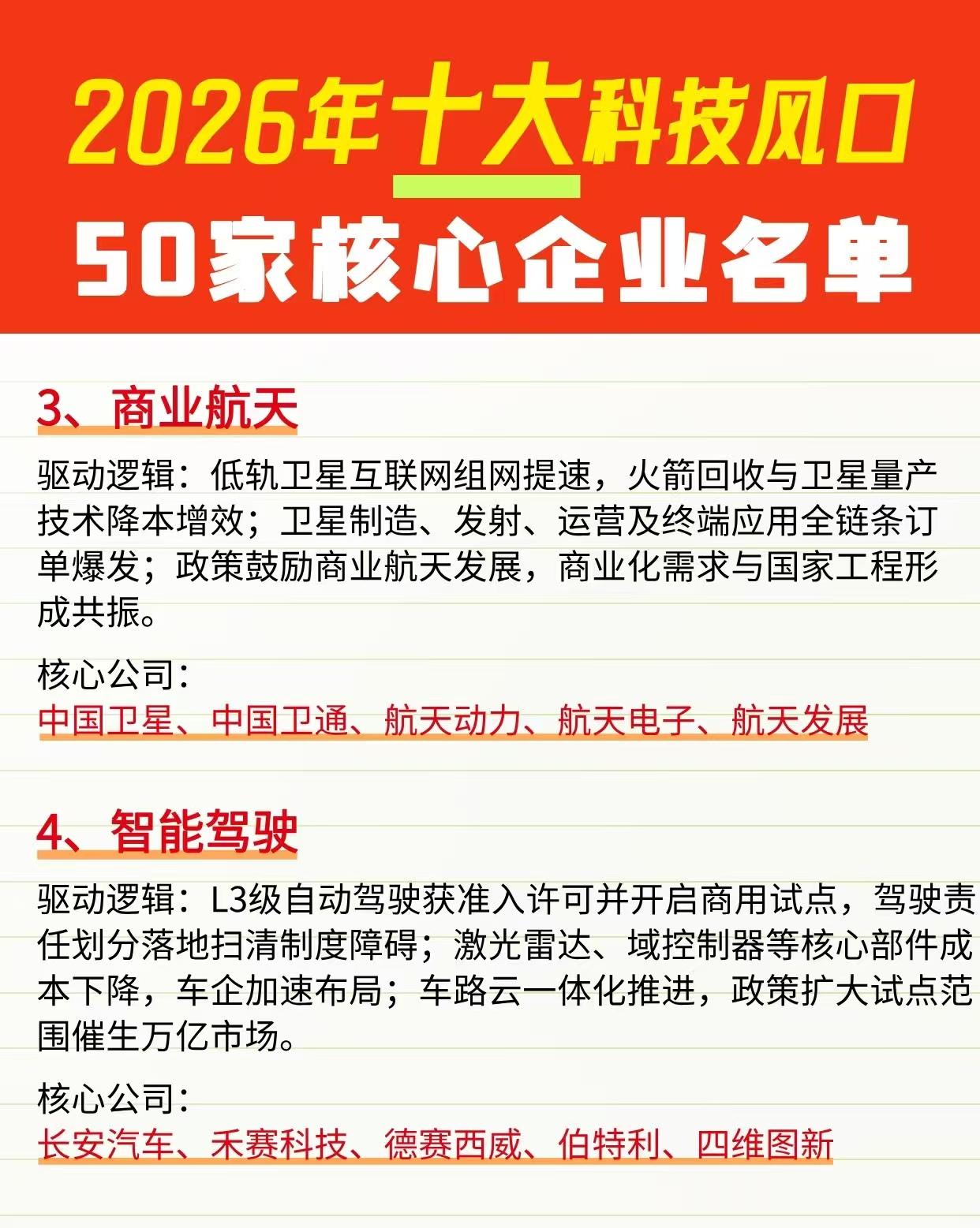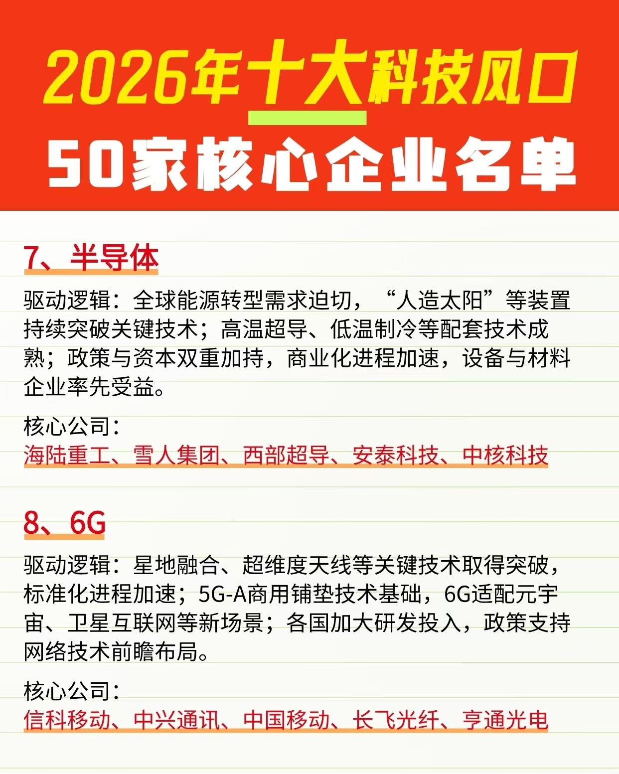 2026科技十大主线潜力方向出炉,以及行业50家核心企业盘点! 2026年的科技赛道风向标来了!十大硬核科技风口新鲜出炉,从人形机器人、AI算力到光刻机、6G,每一个都是未来产业的黄金赛道,相关概念核心龙头企业有哪些? 人形机器人赛道凭借核心零部件技术突破与AI算法赋能,从工业向商用、家用场景快速拓展,绿的谐波、汇川技术等企业站在产业链核心; 商业航天则乘着低轨卫星互联网组网提速的东风,火箭回收、卫星量产技术降本增效,中国卫星、中国卫通等企业覆盖全链条布局。 可控核聚变依托全球能源转型需求,“人造太阳”技术突破推动商业化进程,海陆重工、西部超导等设备与材料企业率先受益。 理财有风险入市需谨慎!资料取材网络仅供参考不能作为投资依据。未来最好行业 科技龙头概念股 未来8大行业 九大未来产业 中国高科技行业 未来产业机会 九大潜力行业