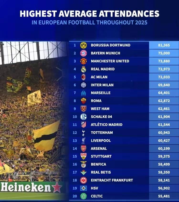 德转发布2025主场上座率排名,米兰双雄分列5和6名,仅次于多特,拜仁,曼联和皇马,奇怪的是大巴黎、巴萨、切尔西和曼城居然榜上无名,是球场坐席太少还少,还是上座率不高呢?罗马是除了米兰双雄外仅有的一支进入上座率前20榜单的,尤文和那不勒斯都不行。就成绩论,曼联的球迷心理素质是真强大,曼联这两年战绩一般,尤其上赛季不是一般的菜,但前来主场观战的球迷可并不少,这些人看比赛时该多揪心!