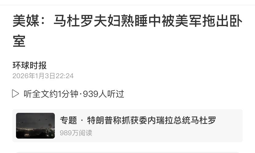 美军空袭,还能熟睡?[捂脸] 环球时报翻译美国媒体的说法:马杜罗是在熟睡中被美军抓走的。 这太让人匪夷所思了。连普通老百姓听到美军战机轰炸首都,火光冲天,都跑出家门,到处躲避。马杜罗作为一国总统还在熟睡? 如果真是这样,那他的结局不能怪别人,只能说根本没有一点警惕性,以为特朗普吓唬他玩呢? 另外他的安保部队也失职啊,美军空袭首都,他们不叫醒马杜罗也不带马杜罗到安全地带,难道等着他被炸被抓吗?[捂脸]