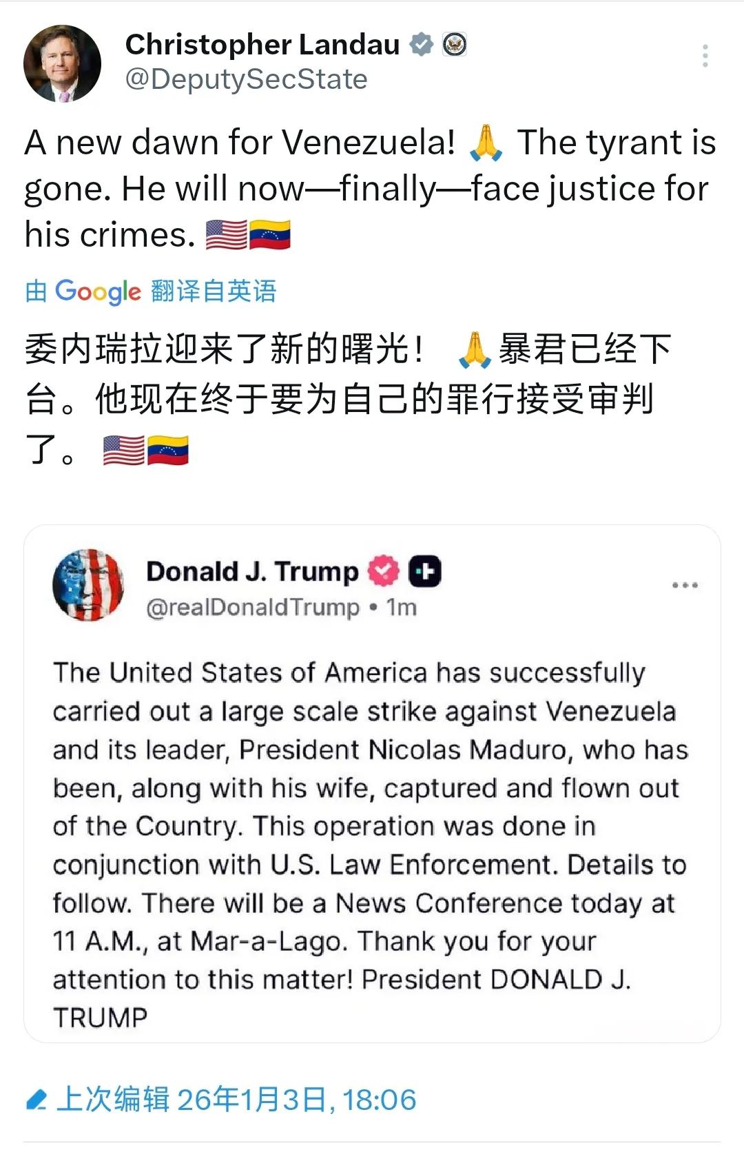 美国副国务卿克里斯托弗今天(1月3日)在转发特朗普的发文(图3)后写道:“委内瑞拉迎来了新的曙光!暴君已经下台,他现在终于为自己的罪行接受审判了。” 克里斯托弗大言不惭,美国无视《联合国宪章》等国际法,袭击主权国家委内瑞拉,并将该国民选总统抓捕并押解到美国进行所谓的审判,被克里斯托弗说的冠冕堂皇,与美国在1989年入侵巴拿马并抓捕其总统如出一辙。当年伊拉克总统萨达姆、利比亚总统卡扎菲仅一句要进行石油欧元结算,触碰了美元霸权,被搞得死无葬身之地。现在的世界依然是丛林法则、弱肉强食,自诩为“世界文明的灯塔”的美国,又干起了打家劫舍的老本行。