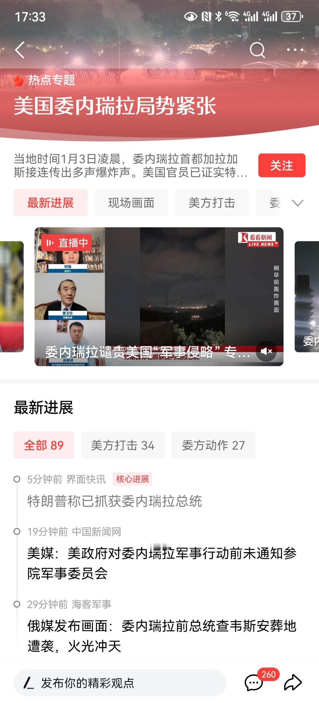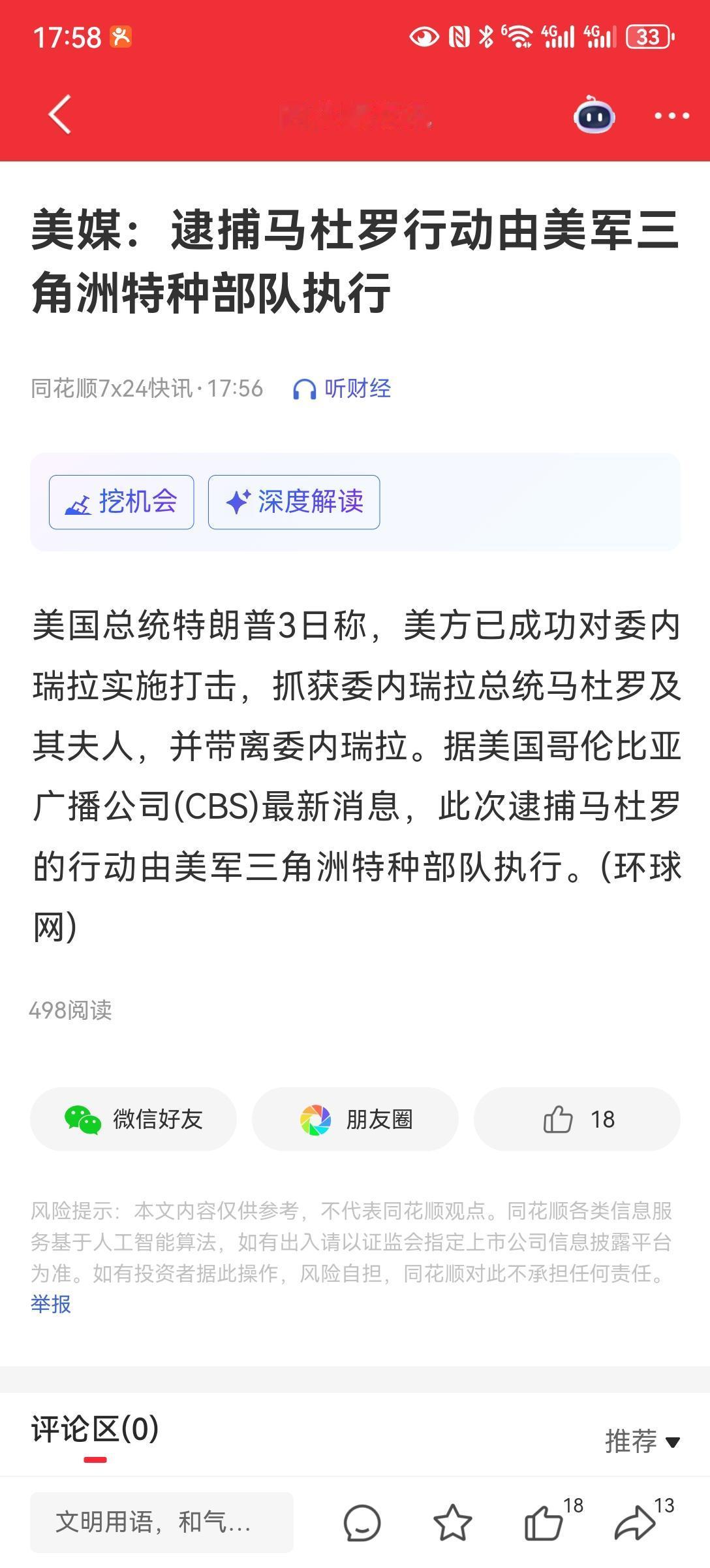 周末,委内瑞拉总体被美国抓 这是什么世道,去别国抓总统,回国审批。 时间真的是弱肉强食。丛林法则。 还好是周六,,看看明天消息,多大A能有多大的影响。不能什么都要我们买单吧。 看来是利好石油,黄金。
