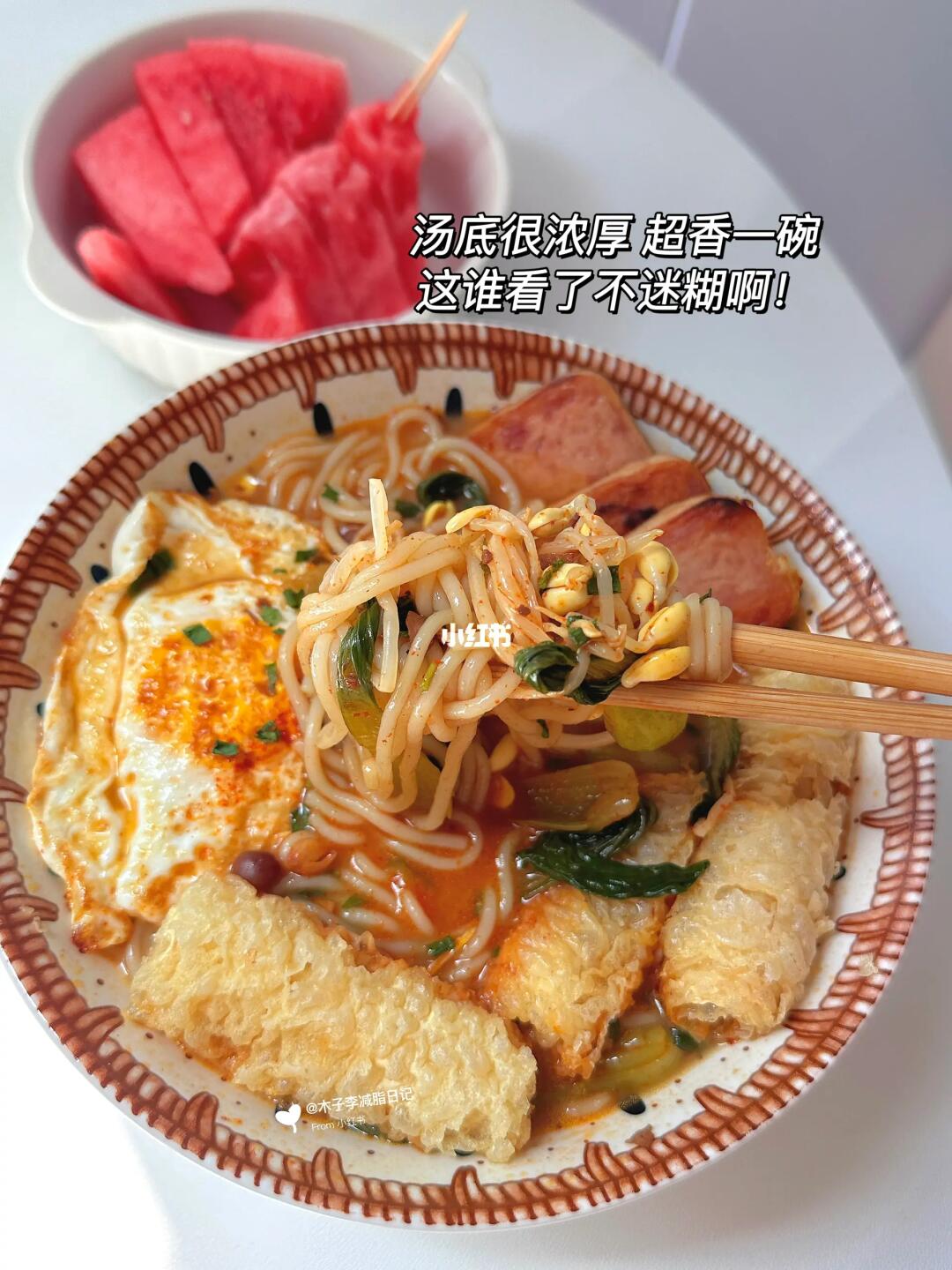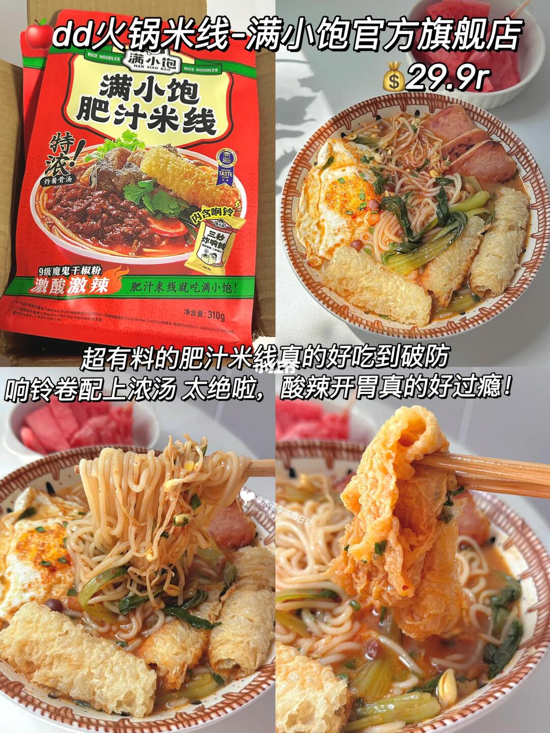 分享给爱吃速食米线面条的姐妹,好吃😋又量大!! 真是宅家的快乐源泉呀~ ①肥汁米线 这个汤头浓郁,酸酸辣辣的特开胃,里面配的响铃卷吸满汤汁简直了! ②番茄牛腩方便面 番茄🍅味特浓,加点菜和鸡蛋看着就流口水啦!面饼是非油炸的,面条劲道 减脂也可以解馋哈! ③青稞方便面 免煮低卡的青稞面,对减肥的姐妹很好友好啦!泡一泡加上喜欢的菜做个炒面也好美味的! ④魔芋速食面 自带料包,直接开水冲泡拌一拌就可以啦,饱腹强热量低,味道也好吃😋