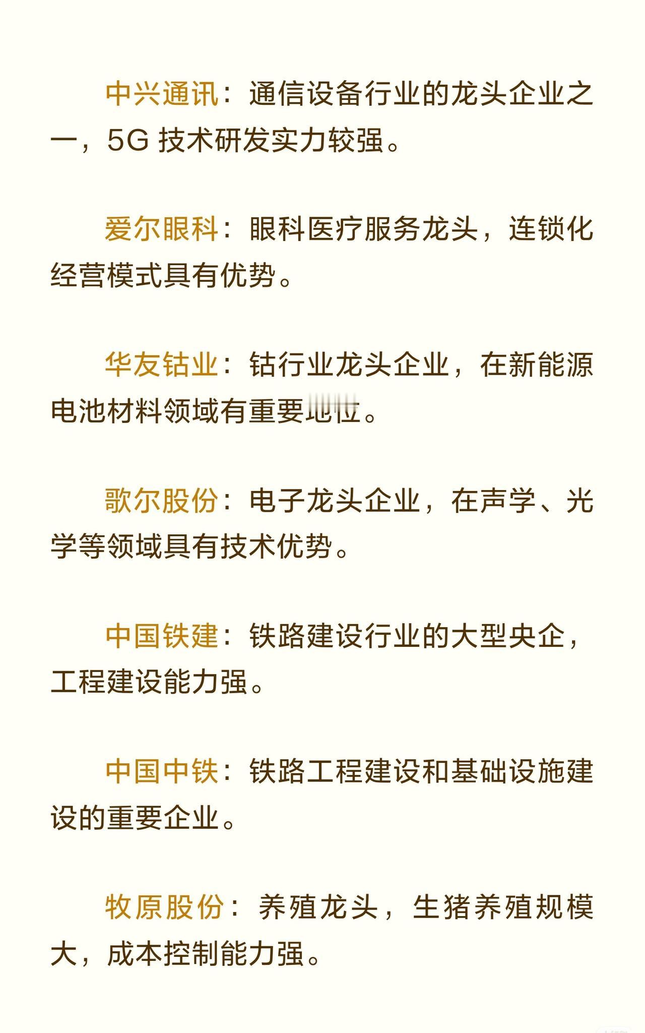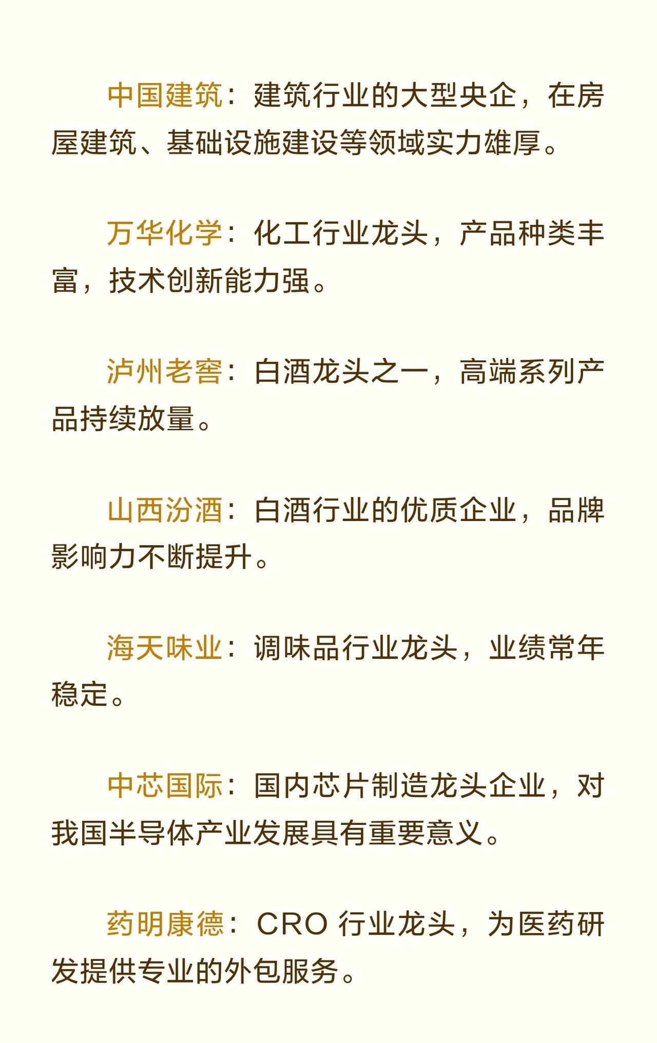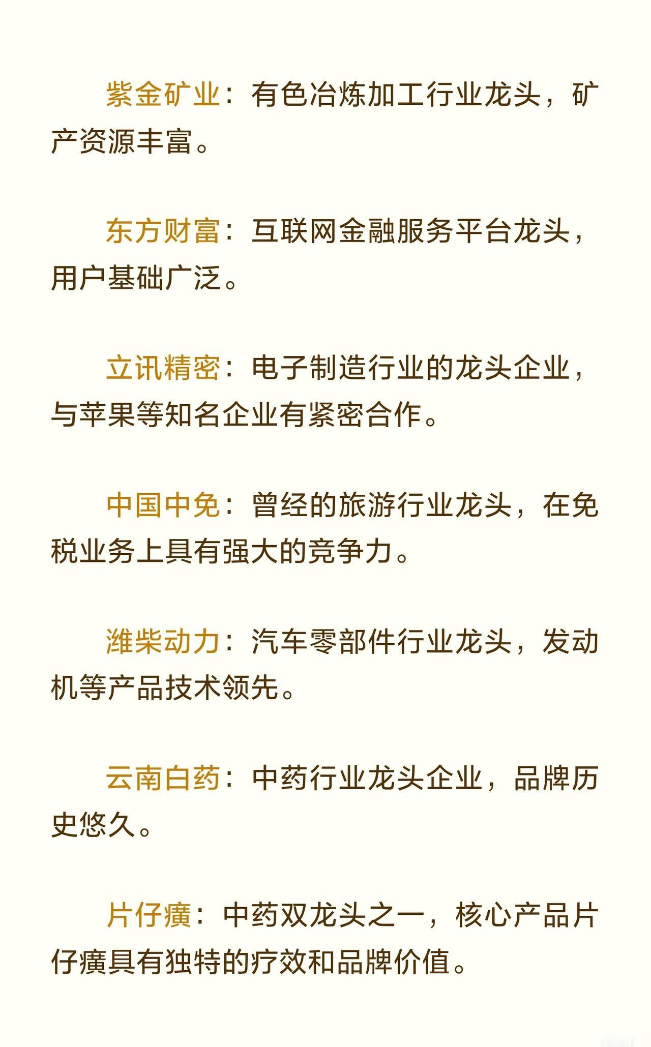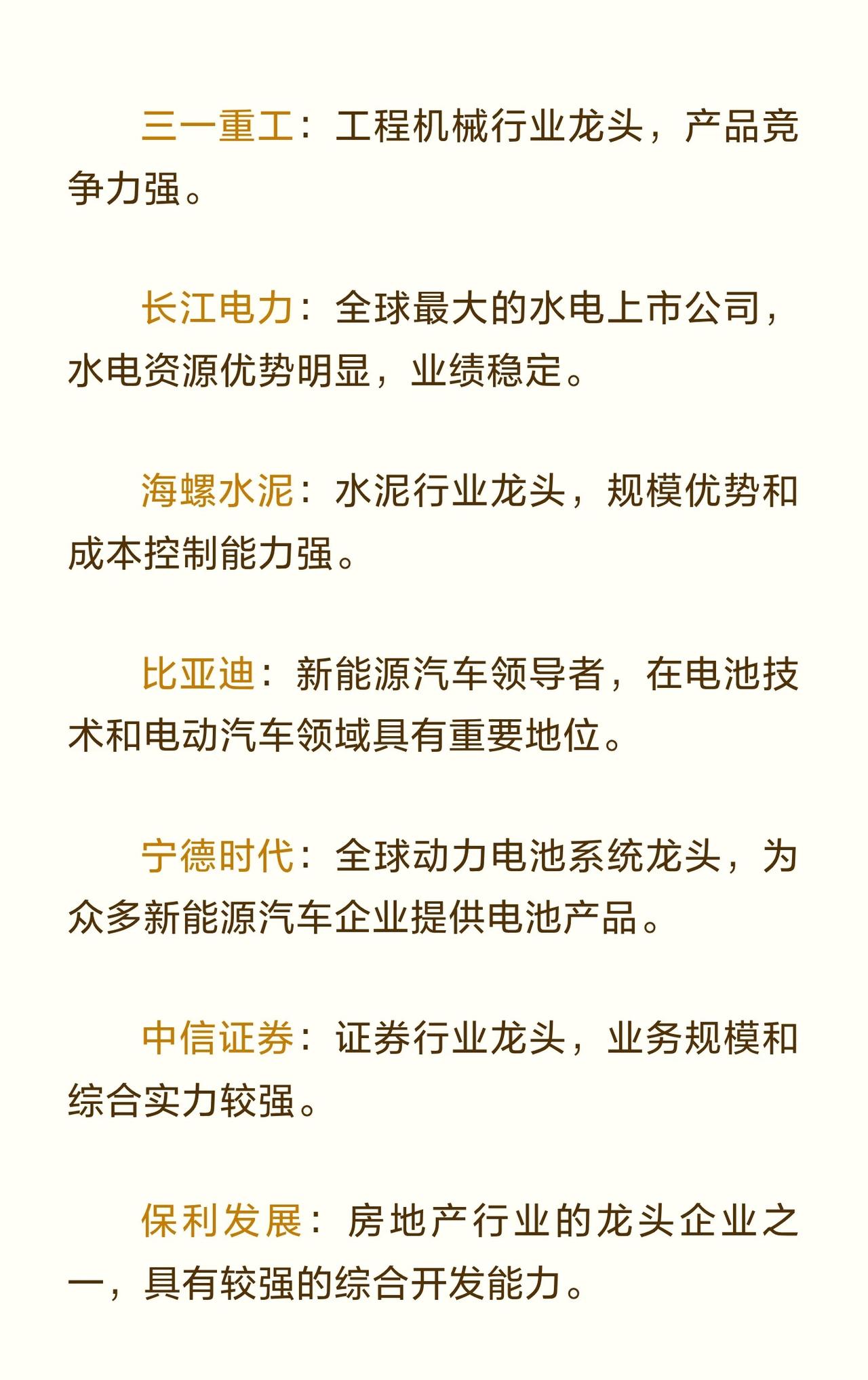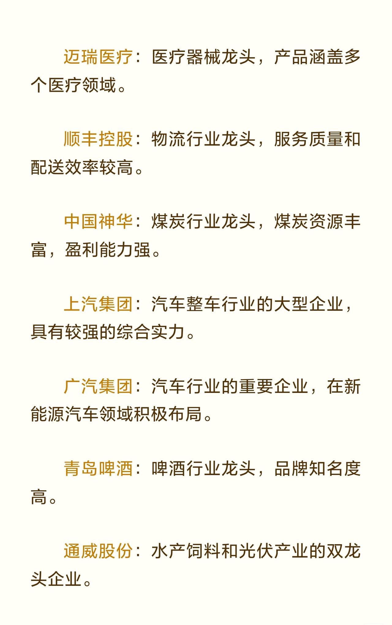 A股蓝筹龙头企业 的信息汇总,共涉及 47家 在各行业中具有代表性的优质上市公司,旨在为投资者提供参考。 在波动的市场环境中,龙头股往往具备更强的抗风险能力与长期投资价值,因此整理了这批蓝筹企业名单。 这些企业覆盖多个重要行业,包括: - 白酒与食品饮料:贵州茅台、五粮液、泸州老窖、山西汾酒、海天味业、青岛啤酒等,均在各自细分领域占据龙头地位,品牌价值高、业绩稳定。 - 金融与保险:工商银行、招商银行、中国平安、中信证券、东方财富等,拥有广泛的业务布局与较强的盈利能力。 - 家电与制造业:美的集团、格力电器、三一重工、潍柴动力、立讯精密、歌尔股份等,在白色家电、工程机械、电子制造等方面技术领先、市场份额高。 - 能源与化工:中国神华、长江电力、海螺水泥、万华化学、通威股份、华友钴业、紫金矿业等,资源优势明显,成本控制或技术创新能力突出。 - 医药与健康:恒瑞医药、迈瑞医疗、药明康德、爱尔眼科、云南白药、片仔癀等,研发实力强或品牌历史悠久。 - 汽车与交通:比亚迪、宁德时代、上汽集团、广汽集团、中国铁建、中国中铁、顺丰控股等,涵盖整车制造、动力电池、物流运输和基础设施建设。 - 科技与通信:中芯国际、中兴通讯、中国中免(免税及旅游)、海康威视等,在半导体、通信设备、安防监控和免税业务中具有竞争优势。 - 农业与畜牧:牧原股份作为养殖龙头,生猪养殖规模大且成本控制能力强。 - 建筑与基建:中国建筑等在房屋建筑和基础设施领域实力雄厚。 总体来看,这批企业均为市值较大、行业地位稳固、盈利能力持续的蓝筹公司,兼具抗风险属性与长期成长潜力,适合作为关注A股市场时的核心标的参考。
