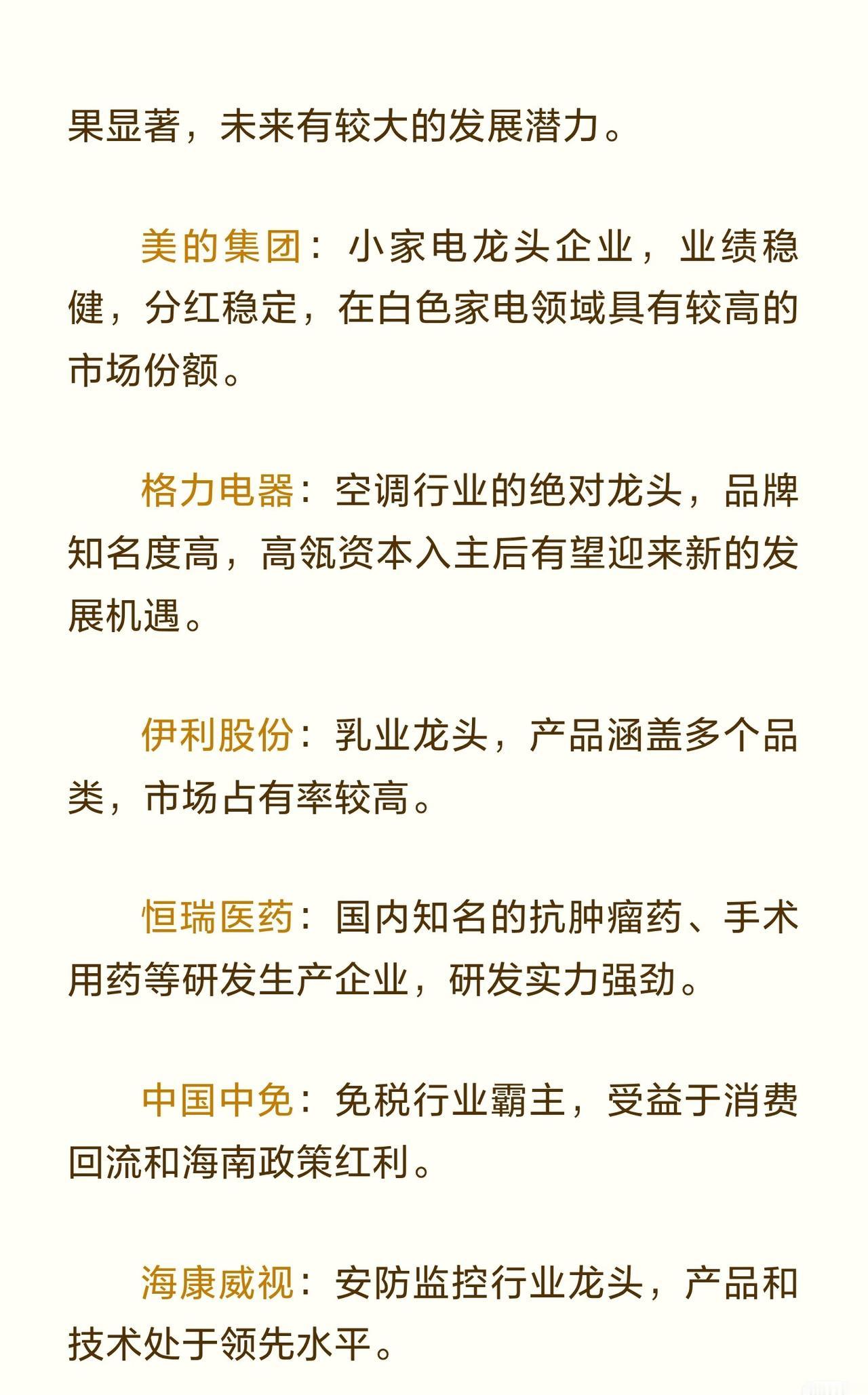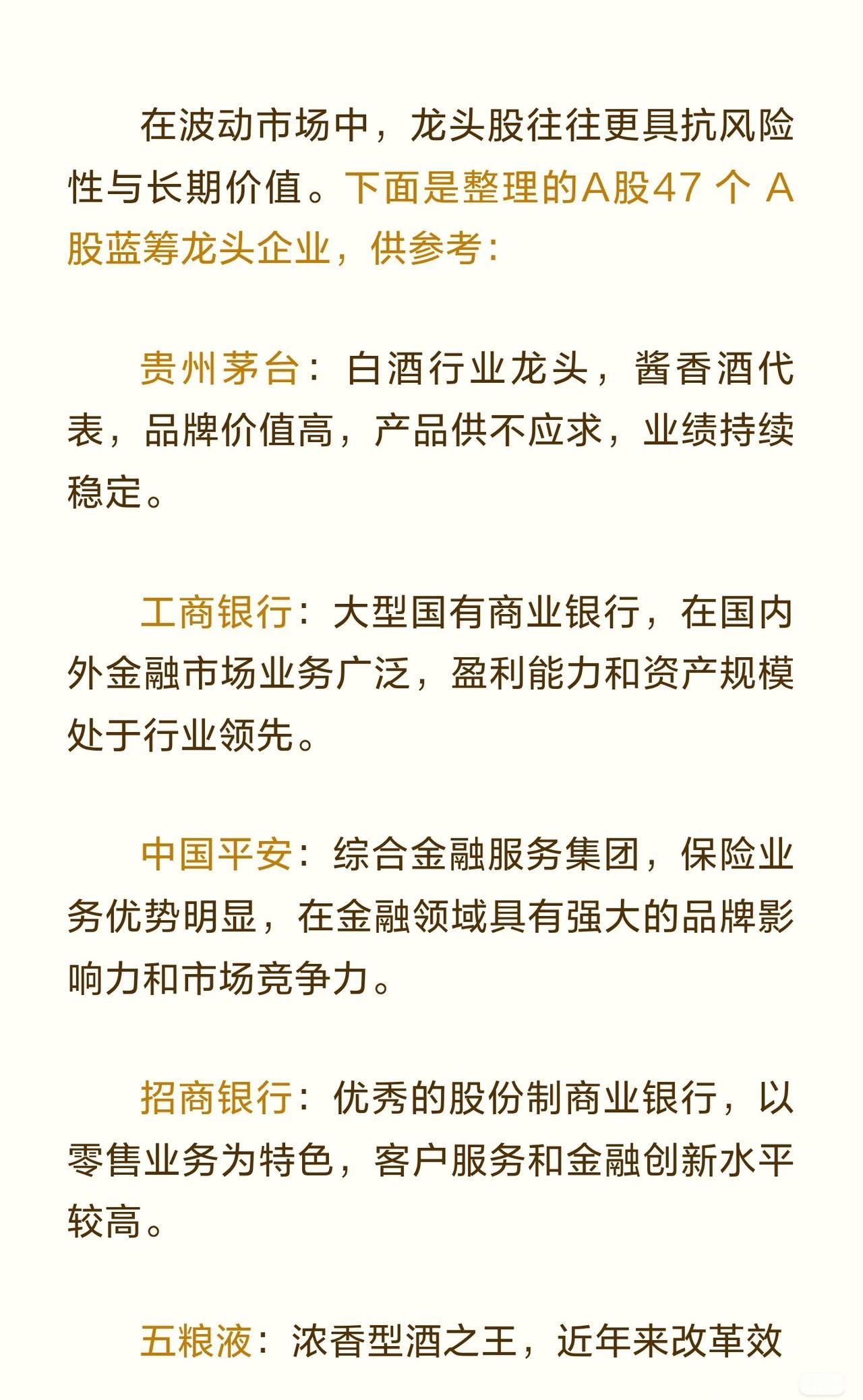 A股蓝筹龙头企业的信息汇总,共涉及47家在各行业中具有代表性的优质上市公司