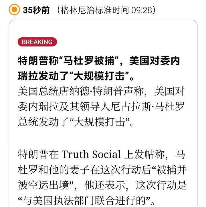 如何看待美军空袭&入侵委内瑞拉? 委内瑞拉政府就遭美国军事侵略向国际社会发表官方声明: 【美军对委内瑞拉境内目标轰炸结束 地点包括军用机场等】当地时间1月3日,总台记者获悉,在委内瑞拉加拉加斯的消息人士称,美军对委内瑞拉境内的本轮轰炸目前已经结束,持续约一小时。轰炸地点包括委军用机场、国防部、港口等目标。(央视新闻) ………………………… 如题,北京时间15:00左右消息显示美军空突委内瑞拉首都。 据CBS记者刚刚消息: 特朗普下令对委内瑞拉境内目标发动空袭,包括军事设施 委内瑞拉总统尼古拉斯·马杜罗宣布进入紧急状态,呼吁民众动员起来“击败帝国主义侵略”。委内瑞拉国家电视台发布通告,呼吁抵抗美帝国主义侵略,不要投降。 哥伦比亚总统佩特罗发文 更新:几天前,特朗普授权对委内瑞拉进行空袭和地面打击。军事策划者最初考虑在12月25日圣诞节当天发起行动,但由于美国在尼日利亚同时展开空袭而推迟,之后又因不利的气象条件再次推迟 ------------------------------------ 他是真行啊,没有人比他更懂斩首! —————————————————————— 已经结束嘞!散了吧,空袭一共持续1h0min 美国官员证实他们此次空袭的主要目标是委内瑞拉的军事设施,加拉加斯的主要军事基地蒂乌纳堡附近或周边发生了数次爆炸。 想象中的地面入侵和斩首行动并没有发生。马杜罗已签署紧急状态令,并下令在“适当的时间和适当的情况下”实施所有国防计划。 和打击胡赛那次并无二致,炸一轮然后懂王宣布赢。美军的空袭近几年也逐渐短小无力起来,毕竟战斧导弹的采购价都涨到几百万刀了。