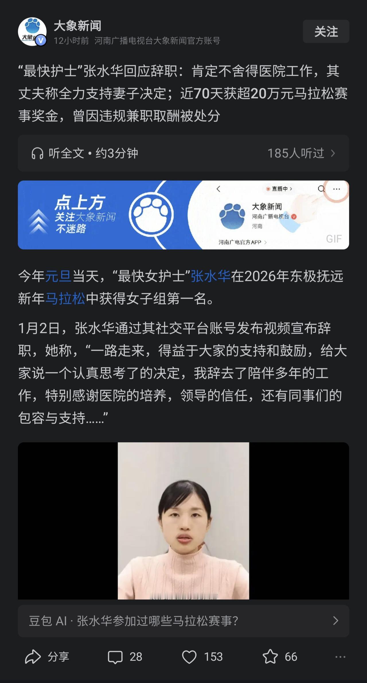 张水华这事儿比连续剧还精彩。一个靠双腿跑成全马冠军的护士,最后因为“跑”太快,把工作给跑丢了。表面看,是“最快女护士”张水华的人设翻车:骗调休、接广告、被处分、最终辞职。但往深里看,这是一个现代职场的大型困局。 “追梦”这个词很美,但它的成本往往是身边同事在默默支付。当“虚假理由调休”被坐实,网友舆论立刻反转,道理很简单,打工人可以佩服卷王,但痛恨所有让自己无偿加班的人。 也有很多人骂医院无情、掐灭梦想,白岩松老师也曾给予过医院建议,如何能够让张水华在职业和梦想间做好平衡。但医院的核心KPI是治病救人,不是培养运动员。我觉得不应当对医院过于苛责 张水华的辞职,看似被逼走,实则也是唯一破局点。对她来说,终于不用在编理由评价参加马拉松,也不用害怕被举报,可以全力开发个人IP商业价值。对医院来说,肃清了职业纪律,给了所有人交代。 其实仔细想想,这件事最扎心的地方在于,我们大多数人,既是“张水华”,也是“她的同事”。我们渴望自己的特长和热爱被世界认可,希望有种制度可以帮助我们,但同时我们又极度厌恶任何一个可能凭借特长破坏公平、让我们多干活的人。 张水华已经辞职,我觉得网友们也不必对于她更加苛责,她即便有错,现在不已经付出代价了吗?