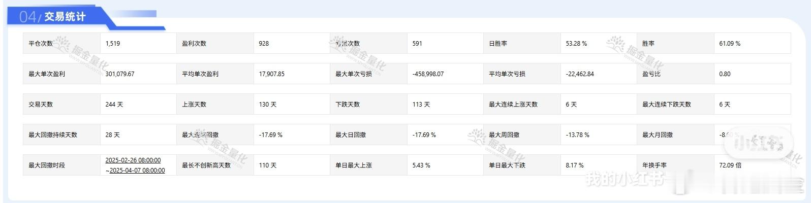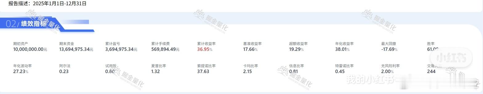 2025年冲之量行策略战绩:36.95%收益,超额19.29%,夏普比1.32!同学们,刚刚收到整理出来俄2025年量化策略的年度成绩单了!这份数据不是PPT,是真金白银跑出来的实盘战绩,全程透明可查,欢迎各位来“挑刺”!核心数据直接拉满:累计收益36.95%,远超沪深300的17.66%,超额收益高达19.29%!这可不是运气,是策略的硬实力。更关键的是,风险控制做得非常漂亮!最大回撤只有-17.69%,夏普比率1.32,说明我们不仅赚得多,还赚得稳,波动小,持有体验极佳。年化收益率38.01%,胜率61.09%,交易天数244天,平均单次盈利17,907.85元。数据不会说谎,这就是我们策略的底气。想了解策略细节?或者想看更详细的回测报告?评论区告诉我,我来安排!量化投资股票策略关键数据速览以下是2025年策略的核心指标,一目了然:累计收益率: 36.95%超额收益率: 19.29%年化收益率: 38.01%最大回撤: -17.69%夏普比率: 1.32胜率: 61.09%为什么这个成绩值得你关注?在2025年这个充满不确定性的市场里,能跑出36.95%的收益,且风险控制如此优秀,实属不易。这背后是团队对市场深度的理解、对策略的持续优化,以及对风险的敬畏。我们不追求短期的暴利,而是追求长期、稳定、可持续的超额收益。这份成绩单,就是我们对“稳健增值”承诺的最好证明。如果你也想在投资中获得超额收益,而不是随波逐流,欢迎关注我,我会持续分享更多有价值的策略和市场洞察。
