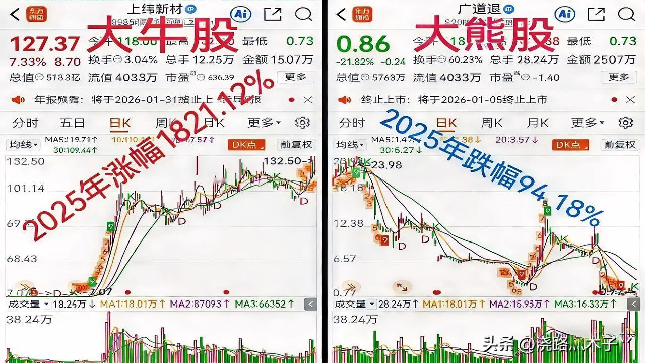 2025年的今天,若你拿100万梭哈上纬新材并捂到年末,恭喜你直接跳级财富自由——1720万的年收益入账,穷鬼秒变富翁; 可要是不幸踩中广道数字的雷,还死扛到年底,那也得“恭喜”你,100万只剩零头,反倒亏欠95万多,成了实打实的“负翁”。 这或许就是A股里大牛股与大熊股的极致魅力:要么乘风上青云,一步登天,要么坠崖入泥潭,万劫不复,赌的就是一把梭哈! 暴富神话难复制,踩雷代价扛不住,一念天堂一念地狱,别让梭哈输掉身家,保住本金,敬畏市场方为正道。 探寻人工智能
