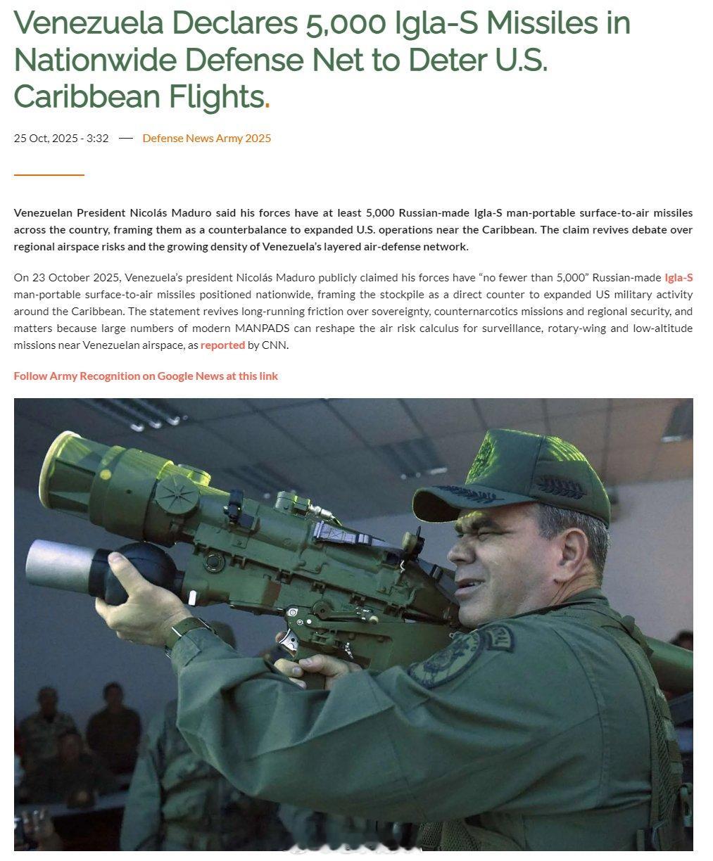 外交部回应美对委军事打击 委内瑞拉拥有俄罗斯的 “针 - S” 便携式防空导弹等装备,大约拥有5000 枚导弹。这些导弹的设计用途包括击落直升机等。但没有一枚 “针 - S” 导弹被用于打击加拉加斯上空的美军直升机。荒诞,抽象。这是昨天委内瑞拉事件中的疑团之一特朗普发布马杜罗在美国军舰上照片美媒称马杜罗夫妇熟睡中被拖出卧室