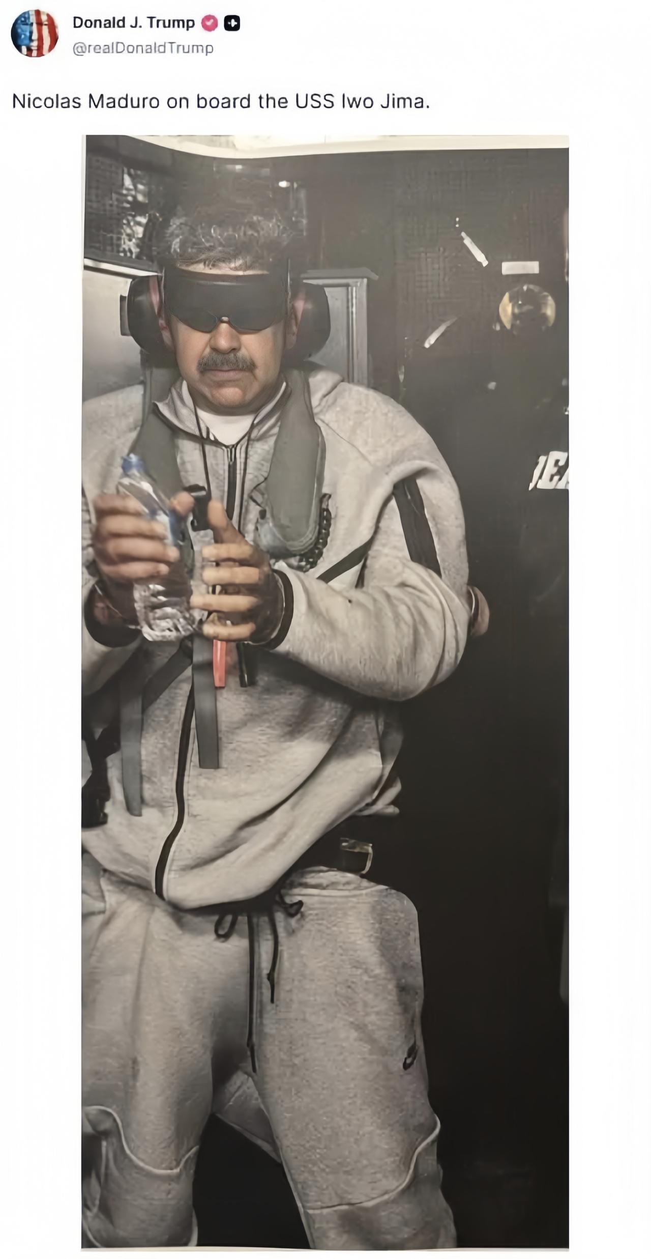 特朗普在个人社交平台上展示了马杜罗被抓的图片。 图片上的马杜罗应该是在美国的军舰上,他带着眼罩,身着休闲运动服,手中拿着一瓶水,看起来很憔悴。 看起来马杜罗的确是被抓住了,而且就在此时,特朗普正在海湖庄园举行记者发布会,向全球通告本次军事行动的过程和细节。