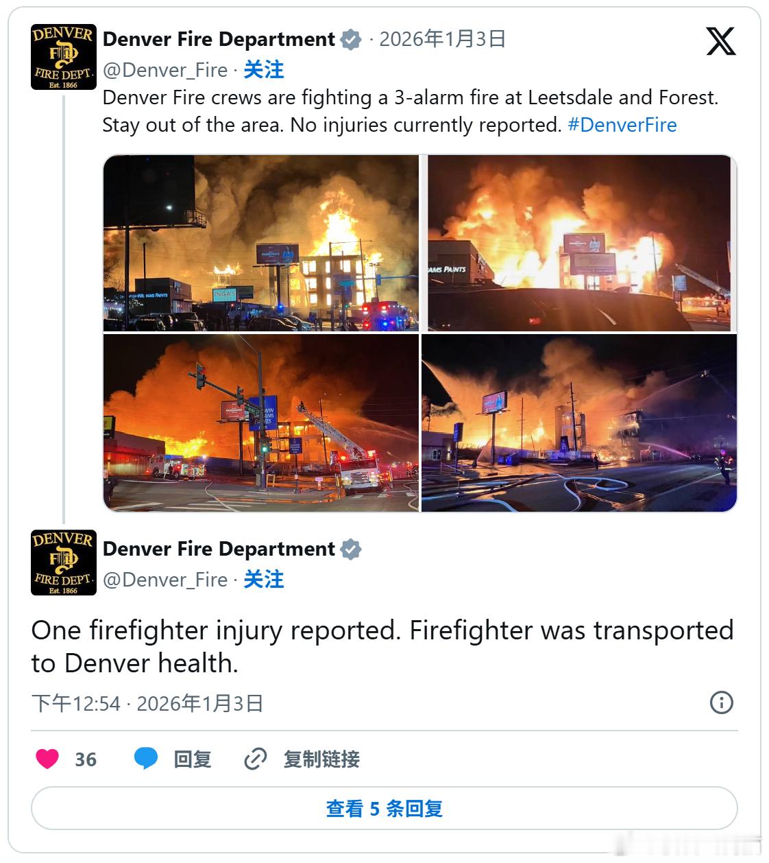 【火光冲天画面曝光!美国在建公寓突发大火 延烧整条街区千余人紧急撤离】海外新鲜事 美国科罗拉多州丹佛市一处正在施工的公寓项目2日傍晚突发火灾,火势迅速蔓延至周边街区,引发大范围停电。当局紧急出动大批消防力量展开救援,并疏散附近居民。目前火势已基本得到控制,但起火原因仍在调查中。据外媒报道,起火建筑为一栋尚未完工的公寓楼,事发后当地警方立即封锁周边道路,丹佛消防部门出动至少100名消防员参与灭火。由于建筑仍处于施工阶段,尚未安装完整的消防系统和防火设施,导致火势迅速扩大,一度升至最高等级的五级火警。灭火过程中,一名消防员受伤并被送医治疗。消防人员连续奋战数小时后,约70%的火势已被扑灭,但部分区域仍存在明火和高温余烬,建筑结构不稳定,救援人员暂时无法进入内部展开全面搜救。目前尚不清楚是否仍有人员被困,消防部门通宵留守,持续清理残火。丹佛消防局负责人罗伯特·墨菲(Robert Murphy)表示,此次火灾导致约1000名居民受到影响,多个街区停电,部分区域居民因安全隐患被建议临时撤离。当地政府已开放社区活动中心,作为临时安置点,为受灾及断电影响的居民提供过夜避难场所。墨菲指出,火灾的具体起因尚未确定,“调查人员已在现场展开勘查和技术分析,目前尚无证据表明这是一起意外事故,还是涉及人为纵火,相关调查仍在进行中。”图:美科罗拉多州丹佛兴建中的公寓突然起火,当局出动多名消防员控制火势,紧急疏散附近住户。 (美联社)