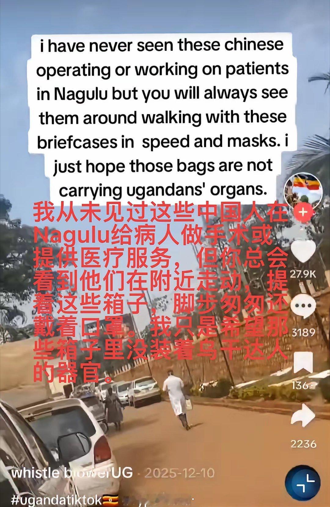 近日,看到一个视频,一个乌干达人拍摄中国医生走在路上,他说从没见过这些中国医生治疗病人,但总会看到他们拎着箱子走来走去…他怀疑箱子里是他们乌干达人的器官….而这些中国的医生是援助乌干达的,结果好心换来了他们的恶意揣测,没有得到一点点感恩之心!这些人真是没救了,脑子不好使,对于中国医生的援助不仅不感恩,还在那造谣恶意揣测,对他们好都还以为是在害他们呢,畏威不畏德!