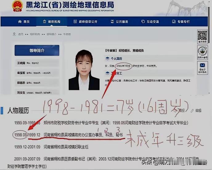 这一张黑龙江测绘地理信息局官网的领导简历截图,算是把个别网友的疑惑值拉满:什么“未成年连升三级”?什么“17岁的孩子大多还在念书,这履历比童话还魔幻”? 有上述糊涂观念的网友,只能证明他们被现在的“卷学制”困惑。他们不知道以前学制短,十七岁大学毕业大有人在,甚至十六岁都有,81年出生的人有些念过五年制小学。假如六岁上学,小学五年,初中三年,中专两年,那个时候能考上中专已经很不简单。 算一算,16岁之前中专毕业,应该很正常。那个时候中专毕业就是干部身份,国家包分配工作。然后,镇里面的什么妇联主任啊之类,听起来是领导,其实就是一般干部,连个副科都不是。至于后来选拔到团县委副书记,应该是年龄和学历的优势。 所以,要了解我们的发展历程,不要逮着谁都去黑人家!