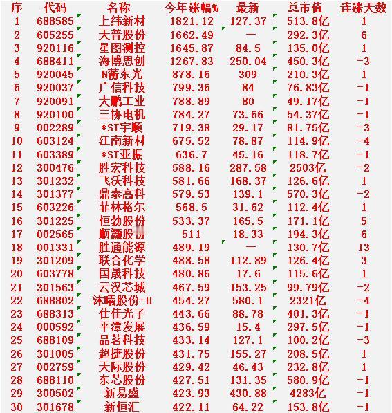 2025年,整个市场“涨幅最大”的30个股一览! 上纬新材:今年涨幅 +1821.12%,总市值 513.8亿元,连涨天数 1天 天普股份:今年涨幅 +1662.49%,总市值 292.3亿元,连涨天数 6天 星图测控:今年涨幅 +1645.87%,总市值 135.0亿元,连涨天数 1天 海博思创:今年涨幅 +1267.83%,总市值 450.3亿元,连涨天数 -3天 N蘅东光:今年涨幅 +878.16%,总市值 210.3亿元,连涨天数 1天 广信科技:今年涨幅 +799.36%,总市值 76.83亿元,连涨天数 -1天 大鹏工业:今年涨幅 +788.89%,总市值 49.17亿元,连涨天数 -1天 三协电机:今年涨幅 +784.27%,总市值 54.37亿元,连涨天数 -1天 *ST宇顺:今年涨幅 +719.38%,总市值 81.75亿元,连涨天数 -3天 江南新材:今年涨幅 +675.52%,总市值 114.9亿元,连涨天数 -4天