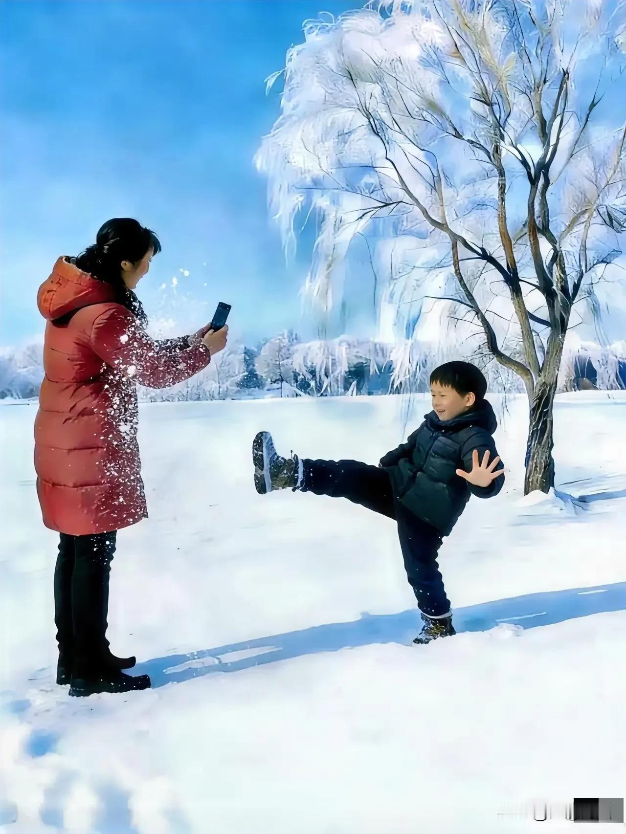 冬日暖阳下,母子雪地嬉戏,童真无邪,幸福满满。