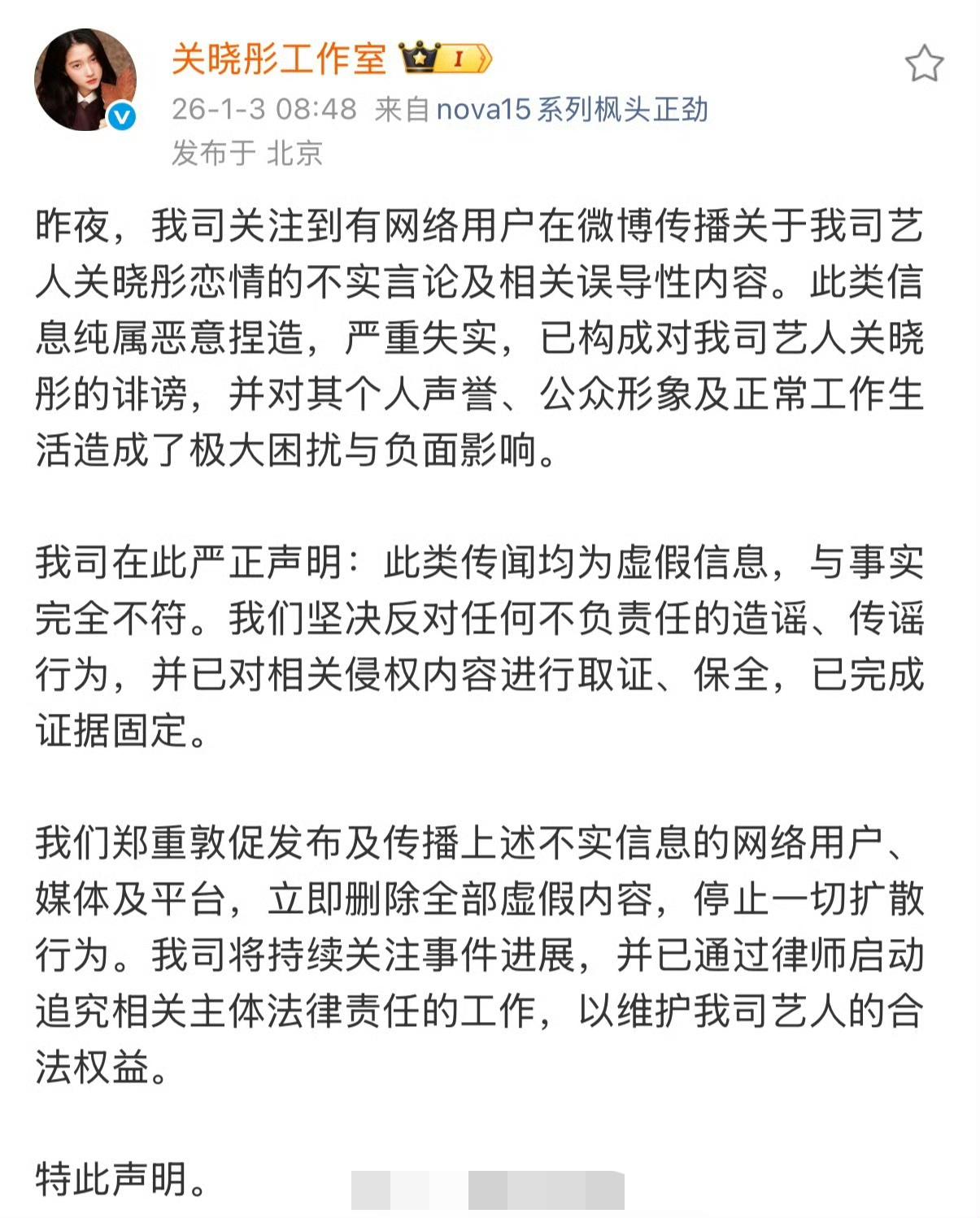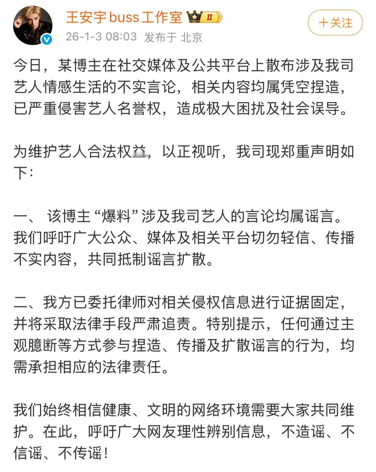 全部都回应了,看来是这女网红病的不轻。 果然被点名的明星都出来澄清了。 有的直接点出祝她早日康复。 有的声明仅是点头之交。 有的直接声明为不实谣言。 为维护艺人合法权益,均表示要诉诸法律、追究责任。 目前被那个女网红点到的艺人都已进行公开回应。 今天的娱乐圈好忙,被这个网红搞乱套了。
