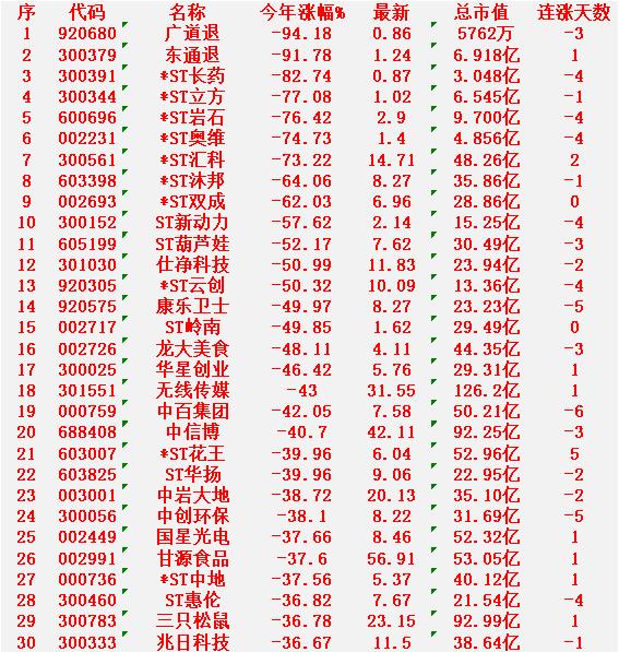 2025年,整个市场“跌幅最大”的30个股! 广道退:今年涨幅 -94.18%,总市值 5762万元,连跌天数 3天 东通退:今年涨幅 -91.78%,总市值 6.918亿元,连涨天数 1天 *ST长药:今年涨幅 -82.74%,总市值 3.048亿元,连跌天数 4天 *ST立方:今年涨幅 -77.08%,总市值 6.545亿元,连跌天数 1天 *ST岩石:今年涨幅 -76.42%,总市值 9.700亿元,连跌天数 4天 *ST奥维:今年涨幅 -74.73%,总市值 4.856亿元,连跌天数 4天 *ST汇科:今年涨幅 -73.22%,总市值 48.26亿元,连涨天数 2天 *ST沐邦:今年涨幅 -64.06%,总市值 35.86亿元,连跌天数 1天 *ST双成:今年涨幅 -62.03%,总市值 28.86亿元,近期无连续涨跌 ST新动力:今年涨幅 -57.62%,总市值 15.25亿元,连跌天数 4天 ST葫芦娃:今年涨幅 -52.17%,总市值 30.49亿元,连跌天数 3天 仕净科技:今年涨幅 -50.99%,总市值 23.94亿元,连跌天数 2天 *ST云创:今年涨幅 -50.32%,总市值 13.36亿元,连跌天数 4天 康乐卫士:今年涨幅 -49.97%,总市值 23.23亿元,连跌天数 5天 ST岭南:今年涨幅 -49.85%,总市值 29.49亿元,近期无连续涨跌