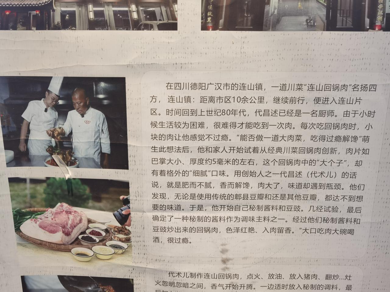 代术连山回锅肉,巴适得很! 新年伊始,我们在四川德阳玩了三天,听说德阳广汉连山有一道川菜回锅肉,名扬四海。既然来到这里,肯定要去品尝一下,美食不可辜负! 元月三日中午,我们慕名来到广元代术连山回锅肉总店。走进店内,见墙上挂满了不少奖牌,央视财经频道曾经还播出过该品牌菜。 我们一行5个人,点了8片回锅肉(一片18元)当热气腾腾的回锅肉端上桌时,一片回锅肉就有巴掌大小(图4)我好惊叹!肉肥而不腻,香而解馋,经过秘制酱料和豆豉炒出来,色泽红艳,唇齿留香,吃着很过瘾,巴适得很!