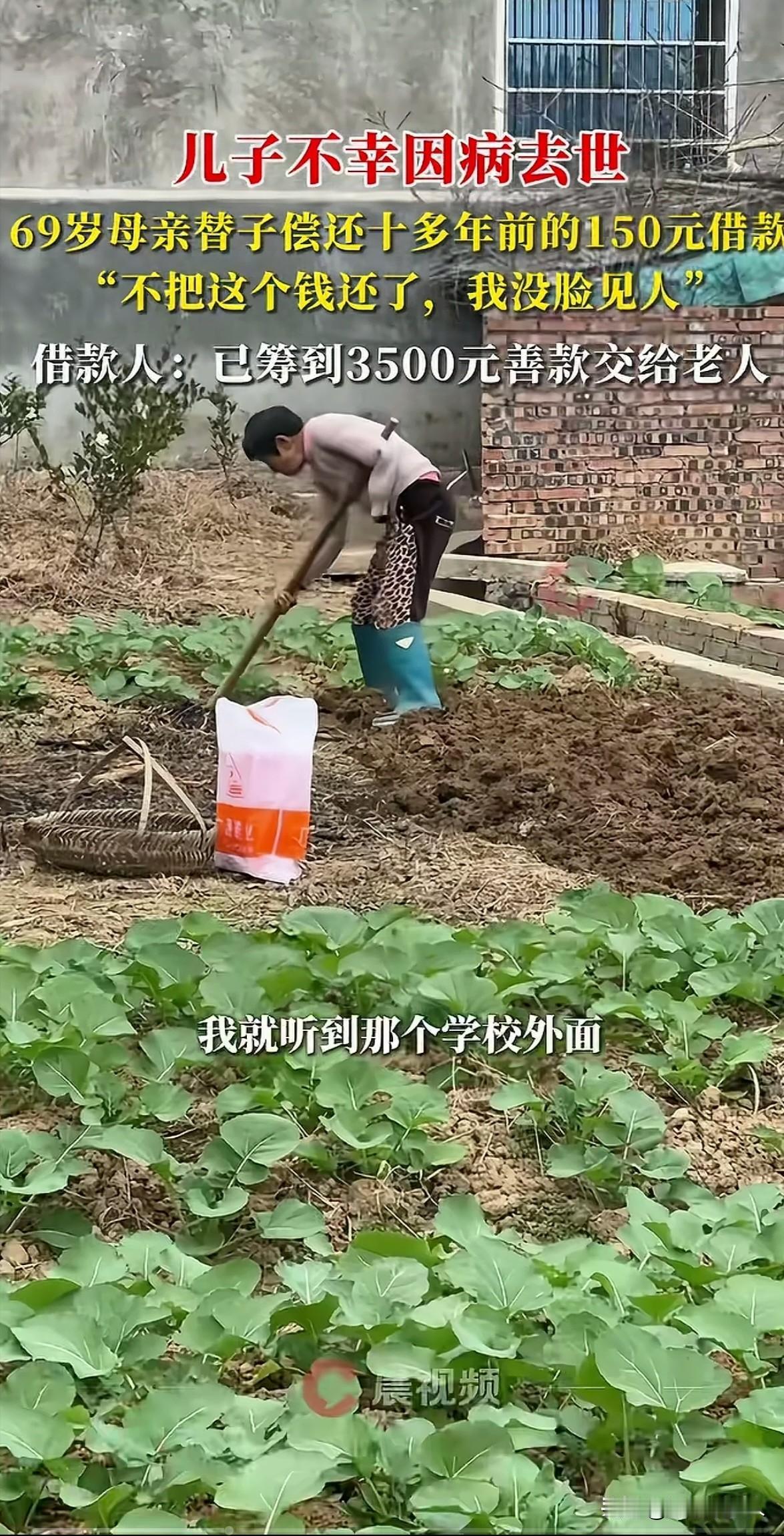 这是份藏着骨子里的善良与诚信! 近日,湖南,一位身形瘦小的69岁老人,她抱着“不把钱还了,我死都不安”的信念,捏着有些皱痕的150元钞票,几经打听,终于站在了村民蒋先生门口。 “你好!还你150元。”老人轻声开口,递上钱。 蒋先生愣住了,满是疑惑:“你为什么要给我钱啊?你没有借我钱,是不是搞错了?” “这是我儿子借的。”老人说道,语气平静却坚定。 “你儿子是谁呀?”蒋先生更不解了。经过一番仔细沟通,一段尘封十多年的记忆才被猛然唤醒。 原来,老人的儿子从小患有哮喘,身体不好,十多年前因急用,曾向蒋先生借了150元。当时蒋先生出于同情,说了句“不用还了”。这么多年过去,他早已将这件小事忘得一干二净。 老人在一个月前承受了丧子之痛。悲痛之中,她听村里人偶然提起,儿子生前似乎还欠着蒋先生一笔钱。于是,她不识字,也不熟悉外界,却凭着一定要“把账清掉”的执念,开始四处打听、询问,费尽周折,才终于找到了蒋先生的家。 而更让人动容的是,蒋先生后来才得知,在儿子去世后的这一个月里,眼前这位省吃俭用、家境简陋的老人,已经用同样执着的方式,一笔一笔地偿还了儿子生前留下的十多笔零星债务,总计三千多元。这些钱,是她从牙缝里省下,一点一滴攒起来的。 蒋先生的内心被深深震撼了。他不仅坚决推拒了这150元,反而带着一份心意和三千多元的善款,前往老人家中探望。看到老人清贫却整洁的家,他对眼前这位瘦小却脊梁笔直的老人,生出了无比的敬意。“人死债不烂”,这句老话,被她用最质朴的行动,诠释得淋漓尽致。 这个故事流传开后,击中了无数人的心: 网友评论: 老人家没文化,也不富裕,且懂得诚信第一,是所有人学习的榜样。 有网友说:“一句话,是良心所在,真诚所在,也许应正了那句俗语,子借父母来还,老人有德啊。” 还有网友说:这是中国人刻在骨子里的诚信,善良。 我想说:这个故事里,没有宏大的口号,只有最干净的行动。150元,对一些人而言不足挂齿,对这位母亲而言,却是儿子留在世上一个必须被擦掉的“污点”,是家族名声上一个必须被补全的“缺口”。她偿还的,早已不是金钱,而是一份“问心无愧”的安宁。 更令人感慨的是那“十多笔,三千多元”的债务清单。我们不知道她是如何一点点核实、一笔笔攒够的。 这个过程本身,就是一部关于“信义”最沉默却最震撼的史诗。她也许说不出的道理,却用脚步和行动,为所有人上了一课:诚信,是与自己的良心签约,它不因债务大小、时间远近、债务人是否存在而改变。 蒋先生最后的回馈,则让这个关于“清债”的故事,升华为一个关于“善意循环”的佳话。诚信感动了他人,善意又回流温暖了诚信者。这大概就是古道热肠最美的模样。 在这个故事里,我们看到了苦难中的坚韧,更看到了人性在朴素中闪耀的、不可摧毁的光芒。这份光,足以照亮很多迷茫的时刻。诚信 诚信感悟 社会诚信