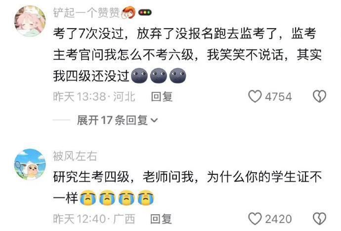考了7次没过,放弃了没报名跑去监考了,监考主考官问我怎么不考六级,我笑笑不说话,其实我四级还没过