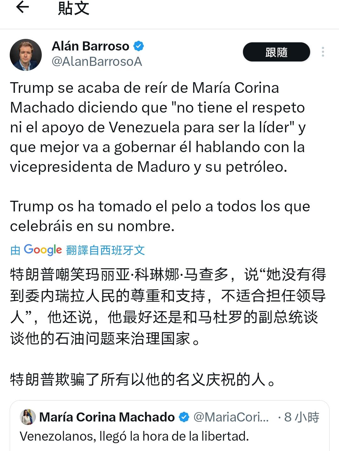 出卖自己国家的人没有好下场! 正当马查多庆祝“委内瑞拉人民,自由时刻已经到来”之时,特朗普一巴掌就呼了过去! 特朗普嘲笑马查多说,“马查多并没有得到委内瑞拉人民的尊重和支持,不适合担任领导人。”他还补充说,国家治理和石油问题,最好还是和马杜罗的副总统谈。 不说别的,就凭她“抢”了诺贝尔和平奖,特朗普就不可能支持她。 Source: X