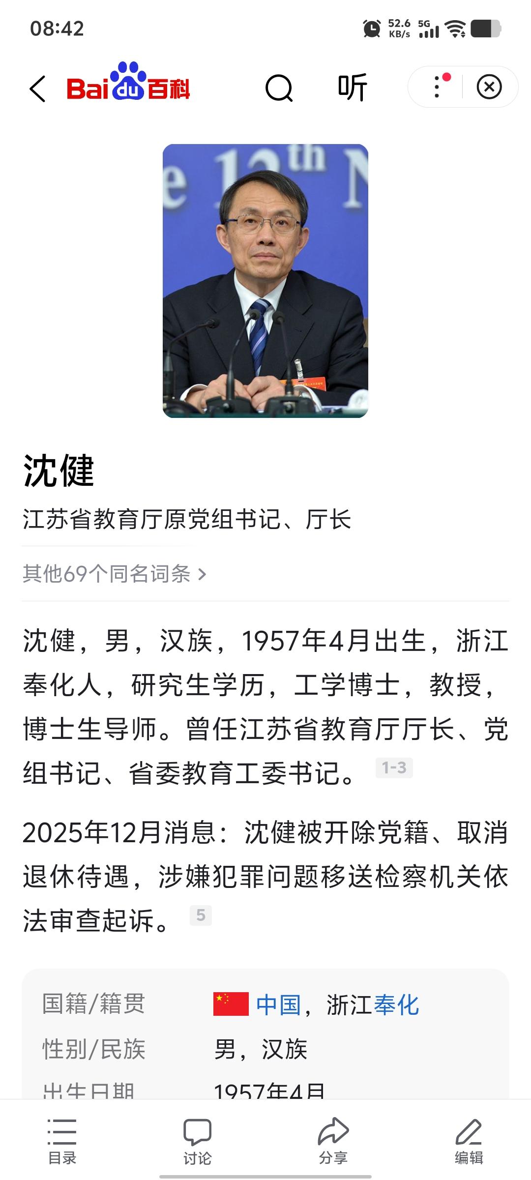 新年刚开始,就有如此重磅的消息披露了。江苏的沈健已经被处理了,双开取消退休待遇。沈健曾经是江苏教育系统一哥,他喝茅子,收礼金,时间跨度非常长。如今退休七八年了,他的问题才被查出来。虽然对他的查处来的晚了些,但也让他以后的晚年也没好日子过了 谁能想到,这位2017年就从省教育厅厅长位置上卸任的“老领导”,退休后还没安分几年,就被纪委监委的利剑找上了门。他大概以为,2017年卸下官职的那一刻,就等于关上了违纪违法的“追责大门”,八年时间足够让所有猫腻被岁月抹平。可他忘了,贪腐留下的痕迹,从来不会因为退休就自动消失——从2012年到2025年,整整十三年的时间里,他一边当着教育系统的“一把手”,一边频繁收受下属和老板们送的礼金、消费卡,就连高档茅台酒都收得心安理得 。更离谱的是,即便已经受到党纪政务处分,他还敢顶风违纪,拉着人去高校内部餐厅搞公款聚餐,喝着高档酒水,让学校买单,这哪里是退休干部,分明是把公权力当成了自家后花园! 教育系统的“一哥”,手里攥着的可是无数家庭的希望。招生名额的倾斜、职称评定的话语权、学校基建的招标、教学物资的采购,每一项都牵着家长的心、关乎老师的前途。沈健倒好,把这些本该用来保障教育公平的权力,变成了换取茅台酒和礼金的工具。想想那些为了孩子能进好学校四处奔走的家长,那些为了评职称熬了无数个夜晚的老师,他们的努力和期盼,在沈健的推杯换盏间,竟然成了可以交易的筹码。更让人不齿的是,他的贪腐不是一时糊涂,而是长达十三年的持续敛财,从在职到退休,贪念就没断过,这样的“教育管理者”,如何能让人心安? 有人觉得,都退休这么久了,取消待遇、名声扫地又能怎样?可真要落到自己身上才知道,这滋味比没钱更难受。以前走在小区里,邻居见了还得客客气气喊一声“沈厅长”;逢年过节,还有人提着礼品上门“问候”。现在呢?通报一出来,他成了人人避之不及的腐败分子,出门怕被人指指点点,在家要面对家人的埋怨,就连曾经围着他转的“朋友”,恐怕也早就躲得远远的。更关键的是,他的违纪违法问题还被移送了检察机关,等待他的可能不只是退休待遇的取消,还有法律的严惩 。晚年不仅要过苦日子,还要背着“罪犯”的污点,这就是他为贪腐付出的代价。 沈健的案子,最让人警醒的不是他贪了多少,而是他“退休不褪色”的贪念,以及“顶风违纪”的嚣张。在省纪委监委通报的五起风腐一体典型问题里,他不是唯一的退休后被查者,但却是少数在处分影响期内还敢违纪的人 。这说明什么?说明有些手握权力的人,根本没把党纪国法放在眼里,总觉得“天高皇帝远”,退休了就没人管,甚至觉得只要不被当场抓住,就能高枕无忧。可他们偏偏算错了一点,现在的反腐早就不是“抓现行”那么简单,不管你隐藏多久、退休多少年,只要触碰了红线,只要损害了群众利益,就一定会被揪出来。 看看通报里的细节,沈健收受礼品礼金的时间跨度长达十三年,从在职到退休,贪腐行为从未停止。这背后,是他对权力的滥用,更是对教育公平的践踏。教育是国之大计、党之大计,本应是最干净、最公平的领域,可沈健却把这里当成了自己的“敛财场”,这样的行为,比普通领域的贪腐更让人寒心。他忘了,自己当年在教育宣传工作座谈会上,还大谈特谈“促进教育公平”“建设教育强省”,转身就用实际行动打了自己的脸 。这种言行不一的“两面人”,最终被查处,完全是咎由自取。 其实沈健的案例,就是给所有手握权力的人提了个醒:退休不是“护身符”,违纪没有“避风港”。权力是人民赋予的,只能用来为群众办事,而不是用来牟取私利。那些在任时敢贪敢占、退休后想“平安着陆”的人,早晚会明白,天网恢恢,疏而不漏。你以为时间能掩盖一切,可纪委监委的调查只会越来越细致;你以为退休就能万事大吉,可贪腐的代价迟早会找上门来。 晚节不保,身败名裂,这是沈健的结局,也是所有贪腐者的必然下场。教育系统容不得半点腐败,权力运行容不得丝毫任性。只有守住廉洁底线,才能真正安度晚年,否则再高的职位、再厚的待遇,最终也会化为泡影。 各位读者你们怎么看?欢迎在评论区讨论。