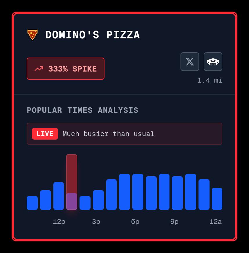 五角大楼的披萨指数依然有效! 数据显示,2026年1月3日凌晨3点,距五角大楼 1.4 英里的达美乐披萨活动量激增了 333%,达到了极端峰值。此时也正是抓捕马杜罗行动开始的时候。 不知道委内瑞拉以及俄罗斯情报机构有没有关注这方面的信息,至少可以提前做出预判,不至于被人家从被窝里拎出这般狼狈。 美帝还是一如既往强大,闷声干大活,丝毫不在意大国形象,也不在乎邻国感情,眼里只有石油生意,佩服!