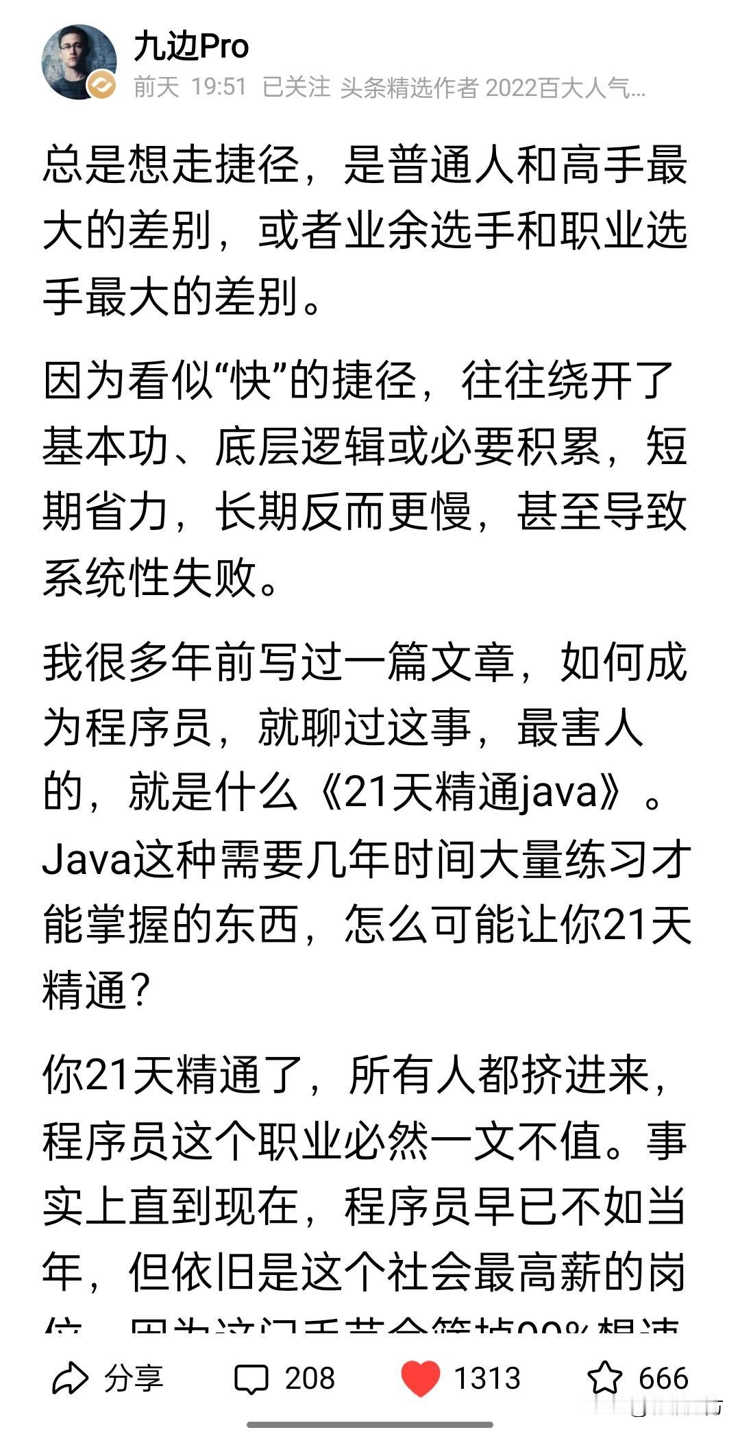 九边说“职业选手与业余选手最大的差别就在于普通人总想走捷径”,而不愿去打磨基本功。 这话当然很对,也算是老生常谈,就是孔子说的“欲速则不达”。道理并不高深,大家应该都能理解,但为什么现实中捷径更吸引人呢? 一方面是人的天性,大多人都是好逸恶劳的,这个很难改变;另一方面是环境的反馈,如果只是道理通畅但在现实中却不断有反例证明道理的片面,那自然就很难落地。让投机取巧无利可图,才会鼓励更多的人脚踏实地。 稍微引申一下,总有人说我们用70年走完了别人两百年的路,昰不是暗示我们在“走捷径”?[捂脸]