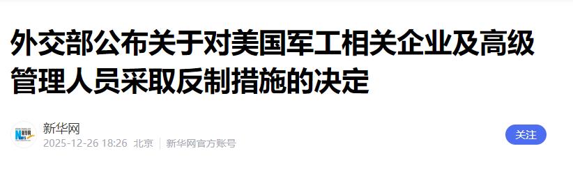 洛克希德·马丁的生产线突然停了,不是缺订单,是中国冻结了他们在华的全部资产。 2025年12月26日,中国外交部公布了一份制裁清单。洛克希德·马丁、波音、诺斯罗普·格鲁曼等20家防务企业及其10名高管名列其中。 指令生效后,这些军工巨头的在华资金流动瞬间冻结,关键原材料供应渠道也被精准切断。这种通过法律手段直接封锁产业链的操作,让这些军工巨头感受到了实实在在的压力。 被制裁名单里的洛克希德·马丁,早年间一直打着“双面算盘”。他们既向台湾销售武器,又在中国大陆经营民用业务。 早在十年前,这家公司就已经涉足中国的核电冷却系统和海洋能项目,试图两头通吃、左右获利。 但这种踩红线的操作终究无法长久,随着制裁措施落地,洛克希德·马丁在华的所有设备被依法冻结,参与的合资项目股权也被锁定,曾经的“如意算盘”彻底落空。 这次反制之所以能直击要害,核心就在于掐住了军工复合体的产业链命门。以洛克希德·马丁生产的F-35战斗机为例,这款战机的制造离不开重稀土,每架的需求量高达400公斤。 而全球范围内,掌握着重稀土分离核心技术的,主要还是中国企业。制裁生效后,洛克希德·马丁的生产成本直接攀升15%,问题根本是全球唯一能提供超高纯度重稀土提炼产品的环节,彻底对其关闭了供应。 五角大楼此前公布的数据,早就暴露了美军装备的致命短板。近八成的武器系统,都依赖中国供应的锑、镓以及稀土矿产。 即便在对华经贸摩擦升级的2024年,美方为了维持武器生产,反而不得不增加对华稀土制品的进口。 这种深度依赖,让此次反制产生了实质性的震慑效果。一旦核心原材料断供,哪怕是造价高昂的高科技装备,也只能卡在最后组装环节,变成一堆无法启用的零件。 面对制裁压力,美国曾试图拉拢盟友抱团对抗,纳瓦罗等政客多次公开呼吁盟友限制对华经贸往来。 但现实很快给了他们一记耳光,墨西哥政府明确选择维护本国汽车和电子产业利益,继续与中国企业保持紧密合作。 日本和澳大利亚虽然嘴上喊着支持美国,实际却没敢取消任何一份与中国的经贸合同。 在实实在在的利益面前,所谓的“同盟关系”出现了明显裂缝,没人愿意为了美国的霸权野心,牺牲自己的经济发展。 美国国内的反对声音也开始冒头。加利福尼亚州的多家科技企业直接将联邦政府告上法庭,明确指出政府的贸易限制措施彻底摧毁了全球供应链的稳定性,让企业蒙受巨大损失。 前美国国家安全顾问苏利文卸任后,也公开承认此前部分涉台动作是严重的战略失误。 那些挑衅行为不仅没能达到预期目的,反而倒逼中方加快了芯片和新能源领域的自主化进程。 同时,解放军在台海的演训早已实现常态化,一系列应对措施层层递进、精准落地。 从限制特定食品进口,到此次切断军工企业全产业链,每一步操作都经过精密测算。 洛克希德·马丁生产线陷入停滞的困境,恰恰印证了,在全球经济深度交织的今天,任何触碰他国主权底线的行为,都必然要付出相应的经济代价。 当然,这种博弈展现了新的逻辑。中国学会了利用资源提炼、市场规模和法律体系等多重优势进行精准反击。 制裁的强度可以根据局势变化灵活调整,但核心前提必须尊重各国主权和领土完整。那些长期靠制造冲突、贩卖武器获利的群体,现在不得不重新评估自己的行为成本。 未来的国际合作,终究要建立在平等互利的共识之上。这就是现实,没人能永远不计后果地透支他国利益,更没人能靠着挑衅底线安稳获利。 信息来源:《外交部公布关于对美国军工相关企业及高级管理人员采取反制措施的决定》,新华网,2025年12月26日。