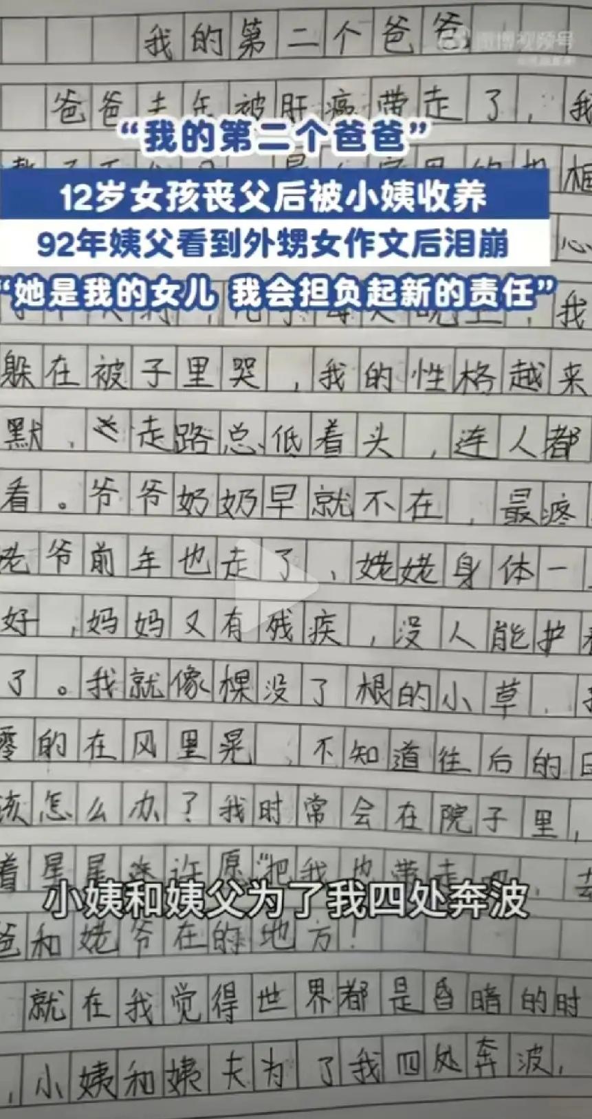 看哭了!92年姨父读12岁养女的作文泪崩,这才是最纯粹的爱与温暖。女孩佳佳父亲病逝、母亲残疾,走投无路时,姨父危一顶着压力领养了她,用耐心和温柔,给了她一个安稳的家。 孩子的作文里,记下了所有的温柔与救赎,也写下了对姨父的满心感激。姨父说不用孩子改口叫爸爸,心里认就够了。 世间最好的缘分,从来无关血缘。一份真心的接纳与疼爱,能治愈所有的苦难,这份善意,温柔了时光,也暖透了人心。