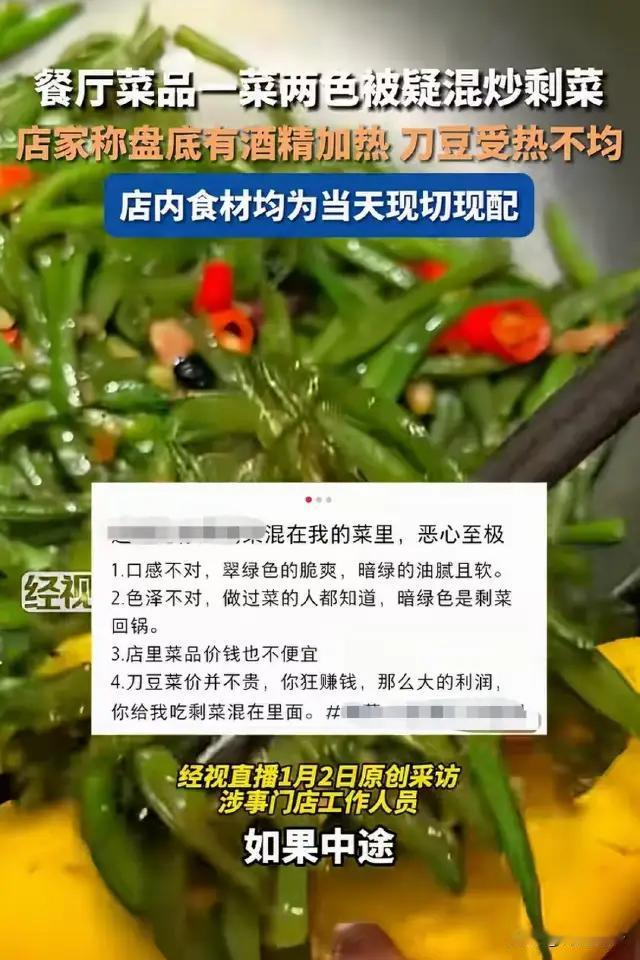 这起事件中,女子因发现刀豆颜色和口感不一致,怀疑餐馆使用“新鲜与回收剩菜混合”的食材,引发了对食品安全的担忧。以下从法律、食品安全常识及消费者维权角度展开分析: ------ 一、法律视角:餐馆是否涉嫌违法? 1. 关键法律依据 • 《食品安全法》第34条:禁止生产经营腐败变质、油脂酸败、霉变生虫、污秽不洁、混有异物、掺假掺杂或感官性状异常的食品。 • 《消费者权益保护法》第8条:消费者享有知悉其购买、使用的商品或接受服务的真实情况的权利。 2. 餐馆可能存在的问题 • 若刀豆确为“剩菜回收”: • 回收剩菜属于“掺假掺杂”行为,违反《食品安全法》,可能面临罚款(最低5万元起)、停业整顿,甚至吊销许可证。 • 若剩菜已变质导致消费者健康受损(如食物中毒),餐馆需承担民事赔偿,严重者可能涉及刑事责任(《刑法》第143条“生产、销售不符合安全标准的食品罪”)。 • 若仅为烹饪差异: • 若刀豆颜色和口感差异源于烹饪时间(如部分炒得过久),则不涉及违法,但餐馆需向消费者解释清楚,避免误解。 ------ 二、食品安全常识:刀豆颜色与口感的合理差异 1. 正常烹饪导致的差异 • 翠绿脆嫩:短时间快炒(如2-3分钟),刀豆保持翠绿色,口感脆爽。 • 暗绿发软:长时间烹饪(如5分钟以上),叶绿素分解导致颜色变暗,纤维软化,口感变软。 • 结论:若同一盘刀豆中部分炒制时间不同,可能出现颜色和口感差异,不一定是剩菜。 2. 剩菜回收的识别特征 • 外观:剩菜可能因反复加热出现颜色暗沉、油渍凝固、菜叶萎蔫等。 • 口感:剩菜因水分流失和氧化,口感可能发柴、有异味(如酸败味)。 • 温度:现炒菜温度较高,剩菜回锅后可能温度不均(如部分温热、部分已凉)。 ------ 三、消费者维权步骤:如何应对此类怀疑? 1. 现场取证 • 拍照/录像:记录刀豆的颜色、口感差异,以及整体菜品状态。 • 保留证据:保存消费小票、菜单,若出现身体不适,及时就医并保留医疗记录。 2. 与餐馆沟通 • 要求餐馆解释刀豆差异原因(如烹饪时间、食材批次等)。 • 若餐馆承认使用剩菜或拒绝解释,可要求书面说明或录音留证。 3. 投诉与举报 • 向市场监管部门投诉:拨打12315或通过全国12315平台举报,说明餐馆名称、地址、问题详情。 • 申请检测:若怀疑食材变质,可要求监管部门对菜品进行抽检(如检测细菌超标、农药残留等)。 4. 法律途径 • 若因食用问题菜品导致健康损害,可依据《消费者权益保护法》第55条要求“退一赔三”,最低赔偿500元;若造成严重后果(如住院),可起诉要求医疗费、误工费等赔偿。 ------ 四、预防建议:如何降低外出就餐风险? 1. 选择信誉良好的餐馆:优先选择明厨亮灶、有食品安全等级公示(如“笑脸餐厅”)的餐馆。 2. 观察菜品状态:现炒菜通常温度高、色泽鲜亮,避免选择颜色暗沉、有异味或反复加热痕迹的菜品。 3. 及时维权:发现问题立即与餐馆沟通,若协商无果,果断投诉或举报。 ------ 总结:理性判断,依法维权 • 若仅为烹饪差异:餐馆需改进烹饪技术,避免消费者误解。 • 若确为剩菜回收:餐馆将面临法律严惩,消费者可依法索赔。 • 消费者提示:保持警惕但避免过度猜测,通过合法途径维护权益,共同推动食品安全环境改善。家常刀豆 嫩刀豆