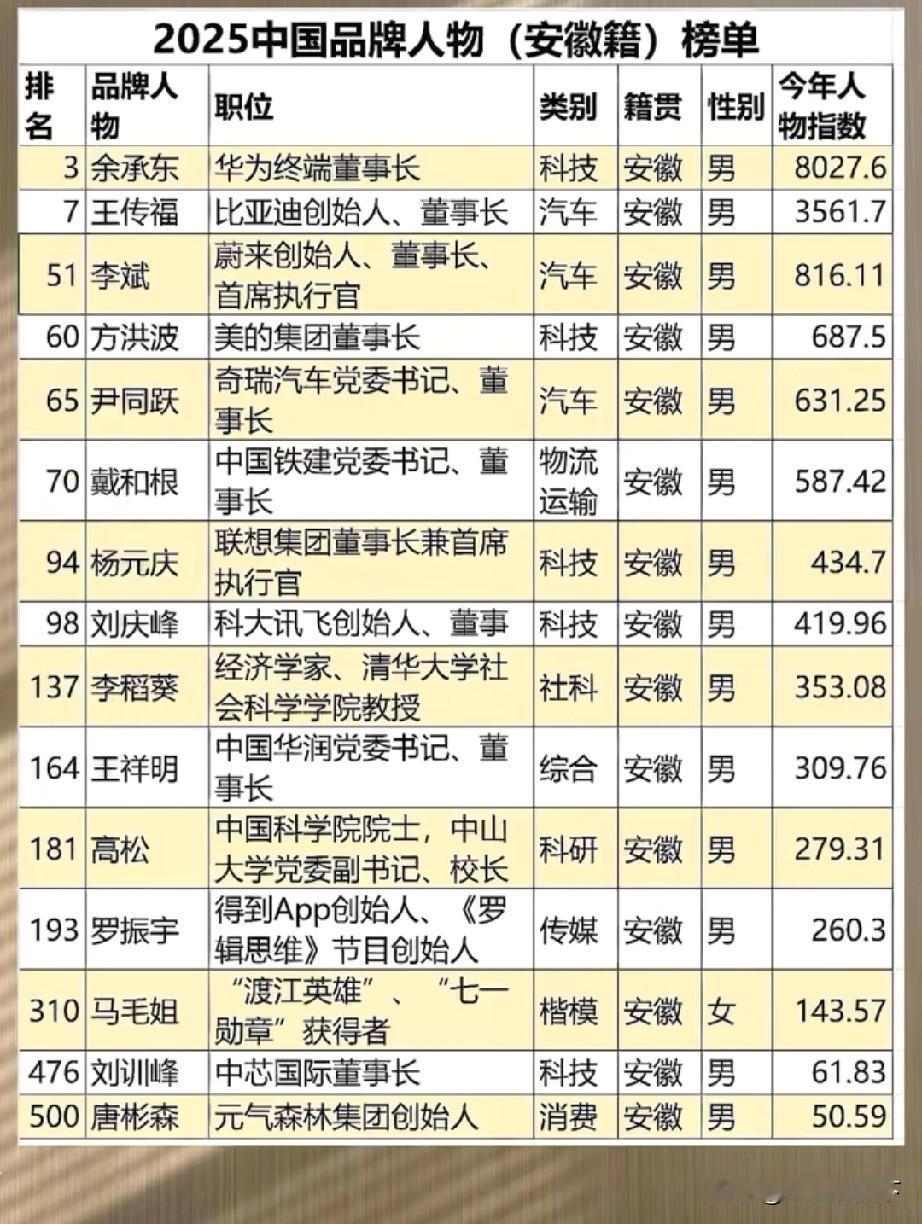 安徽省的品牌人物,你知道几个人?这都是安徽籍杰出人才 2025中国品牌人物,其中安徽省上榜15个人,他们都是安徽籍杰出人才,也是安徽人在外的形象代表,你知道他们中间的几个人呢? 中国品牌安徽人物,分别是:华为的余承东,比亚迪的王传福,蔚来的李斌,美的的方洪波,奇瑞的尹同跃,中国铁建的戴和根,联想的杨元庆,科大讯飞的刘庆峰,清华大学教授李稻葵,华润的王祥明,广东中山大学校长高松,得到的罗振宇,“七一”勋章获得者马毛姐,中芯的刘训峰,元气森林的唐彬森。 中国品牌人物是由品牌联盟、华夏文化促进会等单位联合举办的。江淮名人 合肥能人 安徽十大名人 名人安徽 安徽网络名人