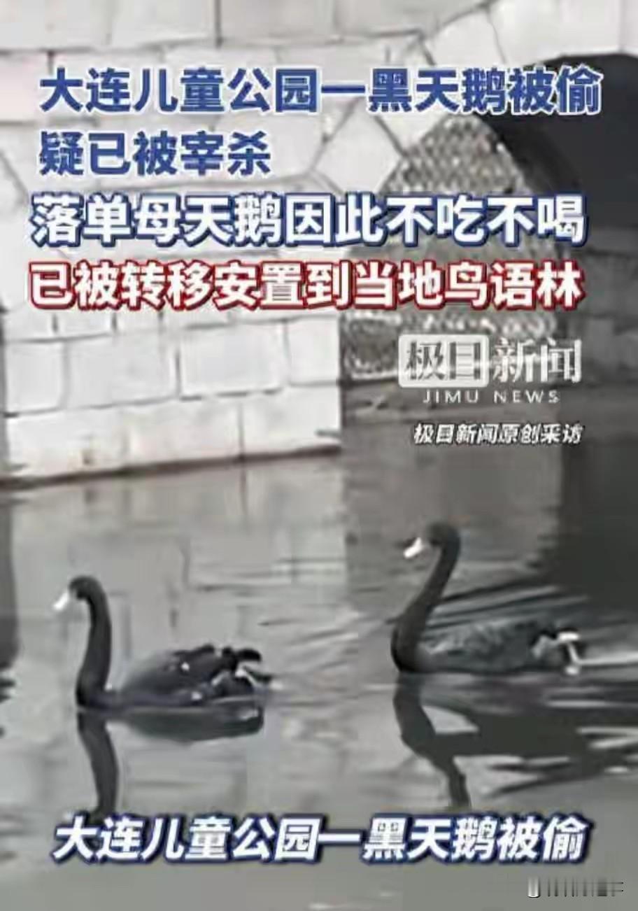 2026年元旦期间,大连儿童公园一对网红黑天鹅一场飞来的横祸,让两只相爱的天鹅从此阴阳两隔,如今后续来了。 监控显示,一名男子抱着一只黑天鹅跑了,大家都盼着赶紧抓到偷天鹅的人。1月3日,警方回应说“不便透露细节”,但有律师出来证实,嫌犯已经被抓获了 由于黑天鹅是动物界严守“一夫一妻”制的物种,幸存的另一只黑天鹅因伴侣失踪出现严重应激反应,拒绝进食,独自在湖面徘徊的模样让不少市民心疼不已,如今已被送往专业机构接受悉心照料。 虽说这对黑天鹅不是国家重点保护动物,是2025年秋天市民买来放养在公园的,但偷别人的东西、伤害动物,照样要担法律责任!听说嫌犯不光偷了黑天鹅,还顺走了一只大白鹅,最后全给吃了,现在已经被行政拘留,后续还得赔钱! 真不知道这个男子是怎么想的,贪吃去市场买一只正经的大鹅就好了,跑来公园偷天鹅吃,真的是服了。