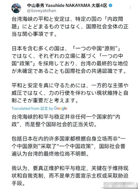 1月3日,日本安倍晋三派系核心成员中山泰秀写到,台湾海峡的和平稳定,并非某个国家的内政问题,而是国际社会全体的合理关切事项。 中山泰秀他是日本政坛的 70 后政客,已经五次当选日本众议院大阪府 4 区议员,履历相当丰富,曾先后担任外务副大臣、防卫副大臣兼内阁府副大臣等重要职务,还是日本国会跨党派 “日华议员恳谈会” 的成员,从这些身份就能看出,他在日本政坛尤其是安倍晋三派系中有着不小的影响力。 更值得注意的是,他的家族立场一贯反华,父亲中山正晖是日本政坛老牌的铁杆亲台派、反华右翼,1978 年日本国会表决《中日和平友好条约》时,中山正晖是五名投反对票的议员之一,还公开攻击条约 “违宪”,极力阻挠中日关系正常化,不难看出,中山泰秀此次的言论其实是继承了父亲的政治观点。 这次除了声称台海和平稳定不是某个国家的内政,他还特意区分了 “一个中国原则” 和 “一个中国政策”,称包括日本在内的许多国家奉行的是后者,还抛出了台湾最终地位 “尚未确定” 的谬论,甚至表示维护和平稳定不需要单方面的主张或威慑,而是要维持现状和自我克制,明眼人都能看出来,他就是在针对中国,暗中支持民进党搞所谓的 “和平台独”。 可能有人会觉得这只是他一时兴起的言论,但了解他过往言行的人都知道,这已经不是他第一次在台湾问题上大放厥词了。 早在 2021 年 6 月,他就在美国智库哈德逊研究所的视频研讨会上,公然把台湾称为 “民主国家”,还宣称 “民主国家之间必须互相保护”,要保护作为 “民主国家” 的台湾,甚至渲染 “中国威胁论”,称中国在太空、导弹、网络空间以及核力量等方面的 “威胁” 正在上升,呼吁日本的应对意识必须觉醒。 那次言论引发了中方的强烈不满,外交部发言人汪文斌当时就提出了严正交涉,批驳他的言论严重违反中日联合声明等四个政治文件原则,违背日方多次作出的 “不将台湾视为国家” 的郑重承诺。 而日本政府方面则出面澄清,防卫大臣岸信夫和内阁官房长官加藤胜信都表示,这只是中山泰秀的个人想法,不代表日本政府立场,日本的 “一个中国” 立场没有改变。 到了 2021 年 9 月,他又拿地理距离说事,称台湾和日本的距离就像鼻尖到嘴巴一样近,所以日本会把台湾的和平稳定当作自己的事,这番言论再次遭到中方驳斥,外交部发言人赵立坚直指这种逻辑和日本军国主义分子当年发动侵略战争的借口如出一辙,是十分危险的动向。 就在前不久的 2025 年 12 月,在自民党同僚高市早苗因涉台言论遭到中方批评并表态 “反省” 的当天,中山泰秀还公开发表 “拥核” 言论,主张日本应讨论拥有核武器以应对 “中国威胁”,这番话直接引发了中俄朝三国的一致反对,俄罗斯外交部警告这会破坏地区稳定,朝鲜官媒称其为 “严重军事挑衅”,中国也重申了反对核扩散的坚定立场。 为什么中山泰秀敢一次次在敏感问题上挑衅? 这和日本政坛近年来的右倾之风不无关系,以安倍晋三派系为代表的鹰派势力不断冒头,他们紧跟美国的步伐,越来越露骨地展现对华强硬态度。 除了中山泰秀,日本防卫大臣岸信夫也多次妄议台湾问题,称台湾的和平与稳定跟日本直接相关;副首相兼财务大臣麻生太郎甚至声称,如果大陆对台动武,日本可能行使集体自卫权,要和美国一同 “防卫台湾”。 这些政客频频插手台湾事务,其实是想借着美国遏制中国的东风,为日本军事松绑寻找借口,扩大自己在地区内的影响力。 但他们似乎忘了,台湾是中国领土不可分割的一部分,台湾问题纯属中国内政,这是国际社会公认的事实,也是中日关系的政治基础。 日本在台湾问题上有着不可推卸的历史罪责,本应谨言慎行,而不是一次次突破底线,向 “台独” 势力发出错误信号,中山泰秀的连续挑衅,不仅破坏了中日关系的稳定发展,也给地区和平稳定带来了隐患。 他试图混淆视听,将中国内政问题国际化,这种做法违背了历史潮流和国际道义,注定不会得逞。 对于任何企图分裂自己国家的行为,中国人民都绝不会答应,任何外部势力的干涉也注定会失败。 那么,大家觉得中山泰秀频频在台湾问题上挑衅,背后还有哪些深层原因?欢迎在评论区留下你的看法。