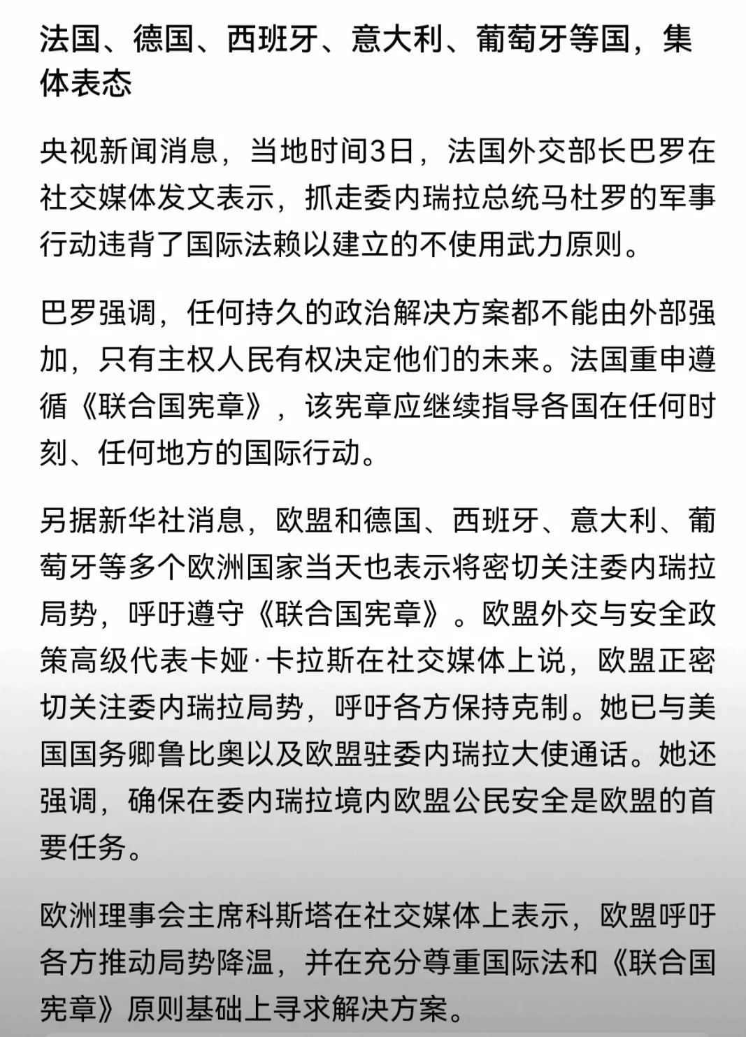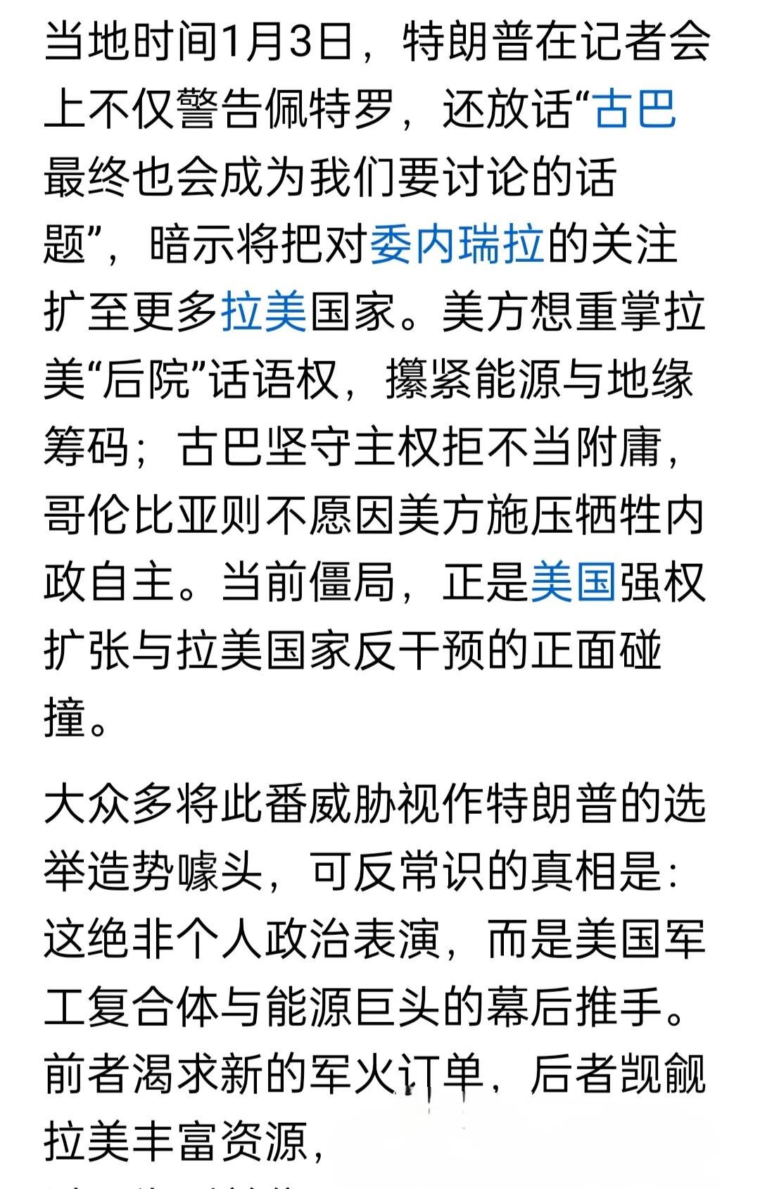 聚焦美国入侵委内瑞拉并绑架总统,三点突出:美国恶霸独大、委内部严重分裂、国际缺乏正义 1、美国恶霸全球独大依然,国际没有能够制约其能力存在。与美国利益相关或被美国捆绑的国家组成利益集团,改集团居于世界主导地位。 2、国家的内部严重分裂,往往会给外敌欺凌甚至入侵、肢解提供“机会”。 3、当下的国际社会,依然是“弱肉强食”、丛林法则横向的“伪文明”时代,联合国在强权面前因利益不同一般散沙、无能为力。 4、中俄等备受美国遏制、打压的国家必须联合起来,维护世界正义,不再让美国肆意莫为,不受限制搞“顺我者昌,逆我者亡”,任由美国将不屈服其的国家各个击破。 5、抢夺重要战略资源、霸占世界地缘要点,正在成为美国霸权新战略方向,这对于严重依赖国际贸易与国外资源的我们必须高度警惕并采取有效的办法应对。