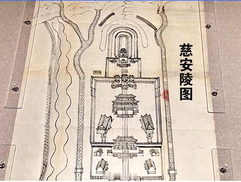 帝后入葬时,要在陵寝门至方城之间搭建平台戗桥,也就是说搭建一个斜坡,这样梓宫就可以抬着走进方城前的芦殿内。由于慈安陵后院进深较短,如果把石五供的五件器物提前摆到祭台上,超过了高度,戗桥就不能搭建。所以慈安陵建成后没有将五件器物摆到祭台上。为了保存五件器物,特在西墙外建了一座库房,叫“尊藏五供库”,将五供以及龙山石等藏在库房内。等慈安皇太后入葬后,才将五供摆在石祭台上。 这张慈安陵图纸,不仅画了五供库的位置,而且所画的石五供的祭台上也没画五件器物。说明这幅图画得还比较严谨。根据档案记载,本打算五供从西墙扒开一个门运进院内,没想到光绪七年不宜在西墙动土,所以香炉、花瓶、烛台五件器物从墙顶上运进的院内。然后将五供库房拆除。现在没有任何遗迹。而慈禧陵的五供库房拆得不彻底,现在还存有遗址。慈安陵图由王沛然提供。