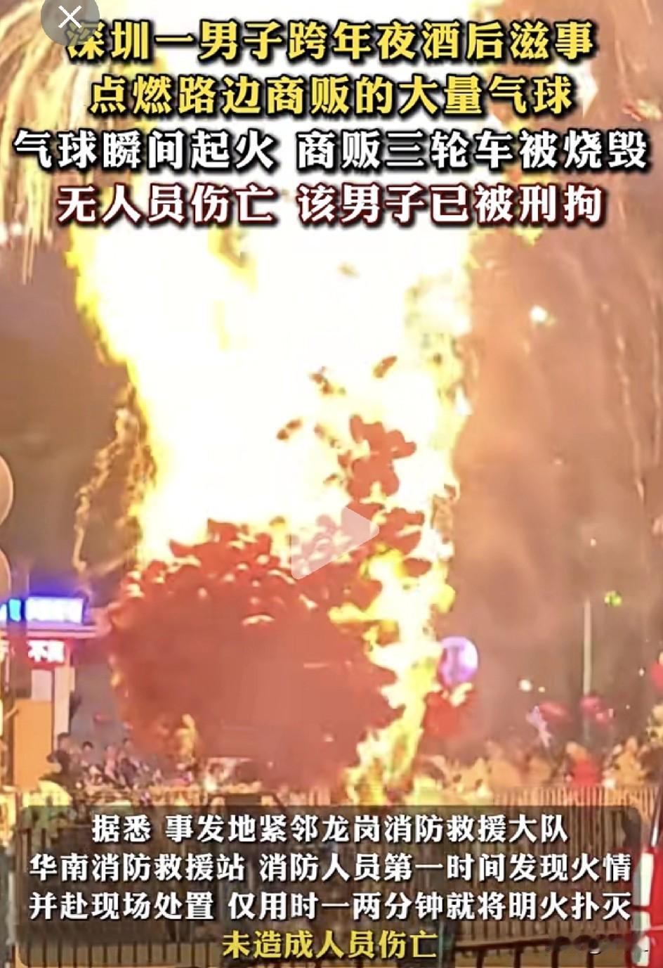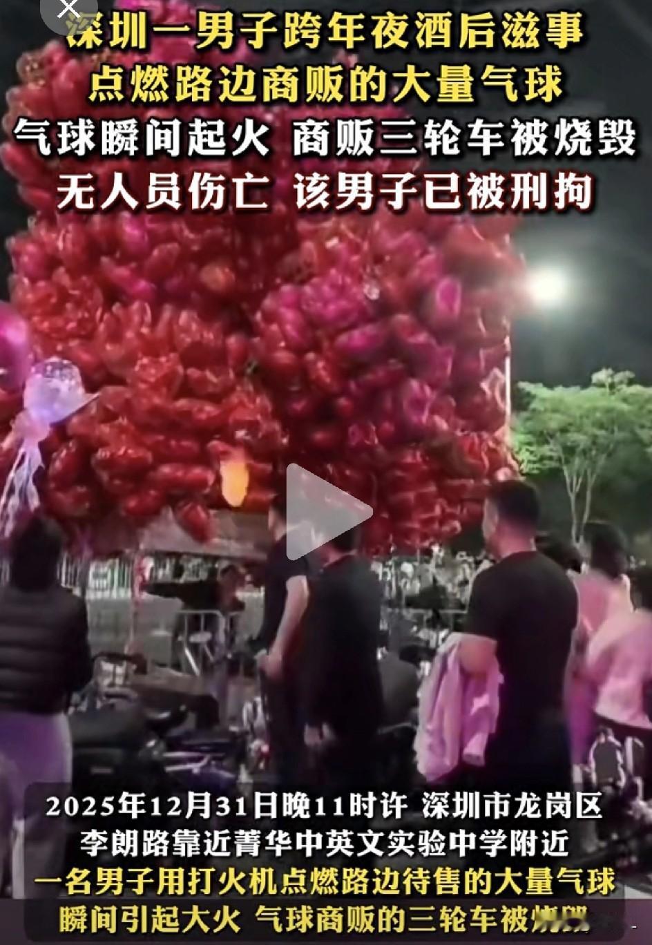 跨年夜,醉汉放“大招”:点气球烧三轮,消防站门口上演“自投罗网”。网友:这是精准放火啊! 跨年夜,深圳龙岗街头,一位大哥大概是酒喝上了头,竟然在消防站门口“玩火”——掏出打火机,“啪”一声把路边卖气球的三轮车点成了跨年“篝火”! 这一幕发生在去年12月31日晚上11点多,龙岗区李朗路附近。卖气球的小贩估计人都傻了:一车气球,说没就没了。火苗“轰”一下窜起来,三轮车瞬间被火吞了。 但搞笑的是——事发地点,就在龙岗消防救援大队华南消防救援站的边上! 消防员估计正备勤跨年呢,一看窗外:哟,业务上门了,还是“秒送单”! 于是,一场可能是史上最快的出警开始了:消防员抄起灭火器冲出去,一两分钟,火灭了。从起火到扑灭,跨年烟花都没这么快结束。 三轮车烧成了铁架子,幸好人没事。事后清理现场,只剩下一股焦糊味和一堆懵圈的围观群众。 警方一查,点火的男子是附近公司的员工,喝大了,行为失控。目前已被刑拘,这下真的要去“里面”冷静跨年了。 网友纷纷调侃: “这叫精准纵火,直接送到消防队门口。” “消防员:今年KPI这么快就完成了?” “气球:我招谁惹谁了……” “危害公共安全罪、纵火罪、破坏财物罪,三罪并罚!” “管不住自己,新年喜提‘刑’拘,恭喜你!” “看到刑拘就放心了!” “酒后见人品!” “过个年 辞职踩缝纫机去了!” “好人啊,一次性把小商贩的气球消费掉了!” 这件事也再次提醒大家:氢气球遇火真不是闹着玩的!之前多地都发生过气球爆炸伤人事件。 这大哥没伤着人,纯属运气好+消防队就在隔壁。 跨年夜,安全第一。酒可以喝,气球可以买,但别拿火苗开玩笑——不然明年跨年,可能就在派出所里数气球了。 素材来源:澎湃新闻,侵联删!