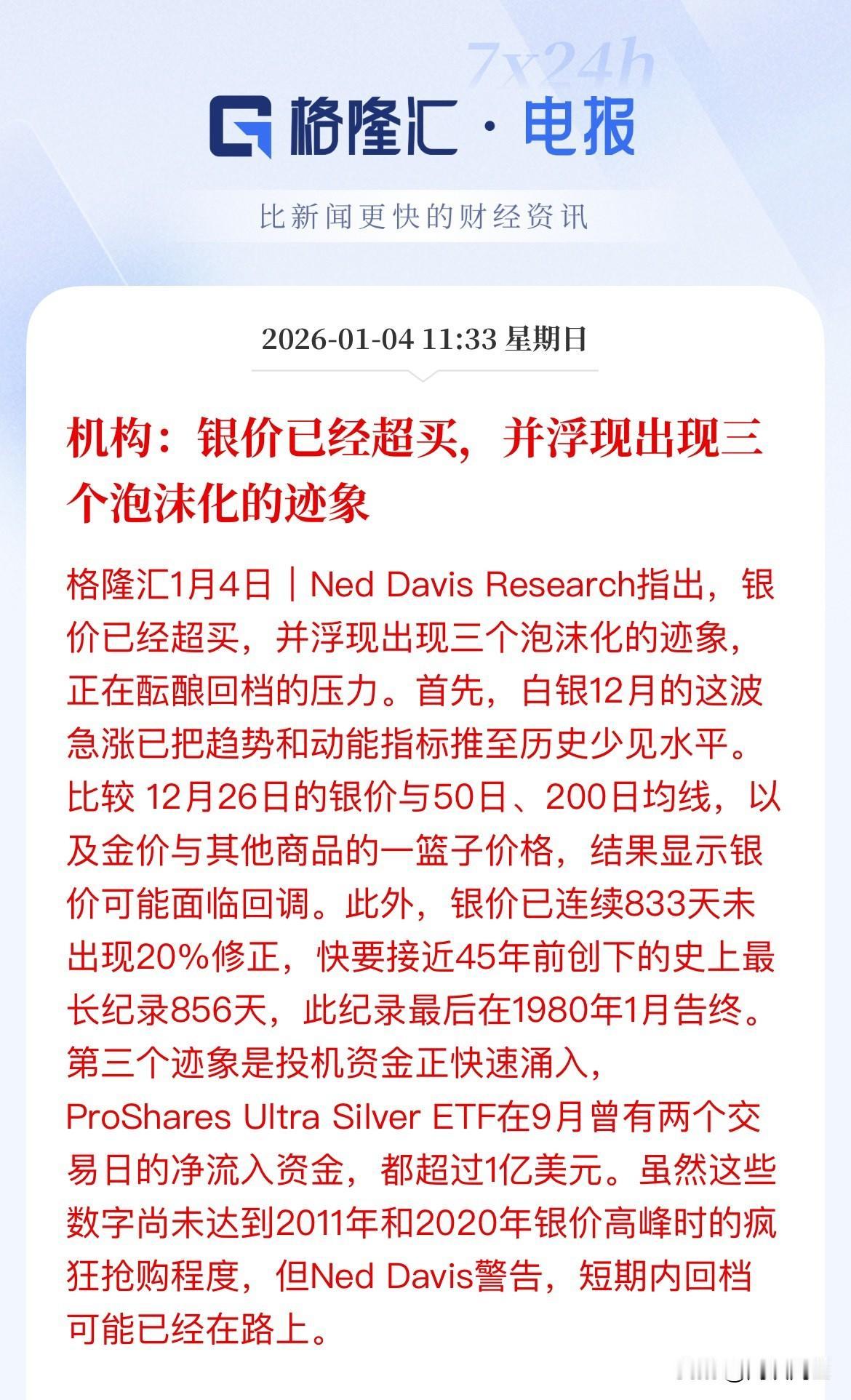 银价超买,泡沫已在路上了?12月单月的疯狂走牛,上涨动能不足了?短期有回调的需求了? 只能说在里面的人想涨,在外面的人想跌,没有想法的漠不关心, 市场已经从你怕涨他越涨,你想他跌他不跌的圈里面,都在认为肯定会涨回来了, 有调整就有资金想进去博短线机会,资金是贪婪的,但这个的涨幅,是机会还是风险,天知道, 毕竟都说以史为鉴,但当前的社会环境和政治局势已经翻天覆地了,继续的疯狂飙升还是真如他所说有调整需要, 就看那些疯狂的投机基金什么个想法了,市场是情绪也是资金推出来的涨幅。
