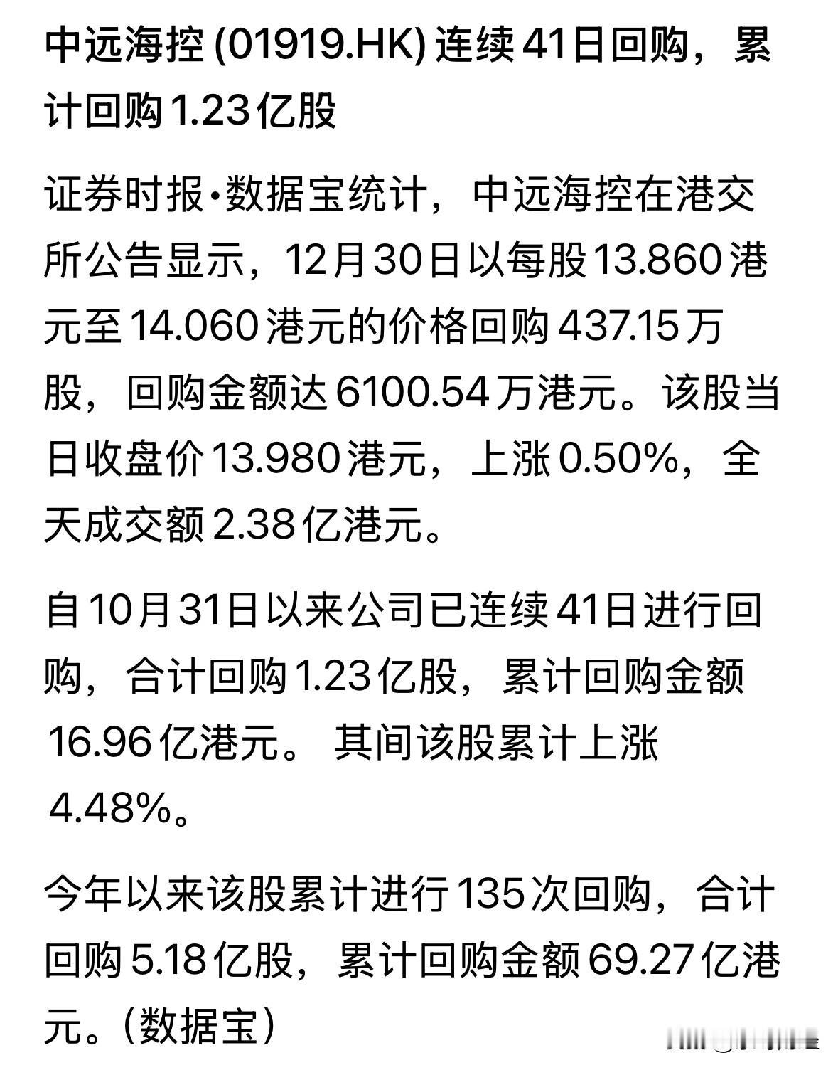 中远海控25年的回购达5.18亿股,金额69.27亿港元,回购均价13.37港元