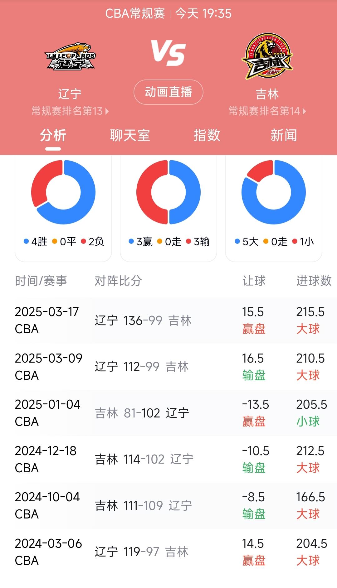 今晚4连败的辽宁男篮迎战3连败的吉林男篮,对于球迷来说这场比赛收视率应该是比较高的,从最近6场的交手记录看辽宁男篮是4胜2负的成绩占据绝对优势。 不过目前辽宁男篮球员伤病比较多,辽宁男篮的外援跟吉林男篮的外援水平也差不多。因此我认为这场比赛双方实力其实很接近,辽宁男篮或许能赢下吉林男篮,但是过程注定会很艰难,仔细想想这正是本场比赛的走势。