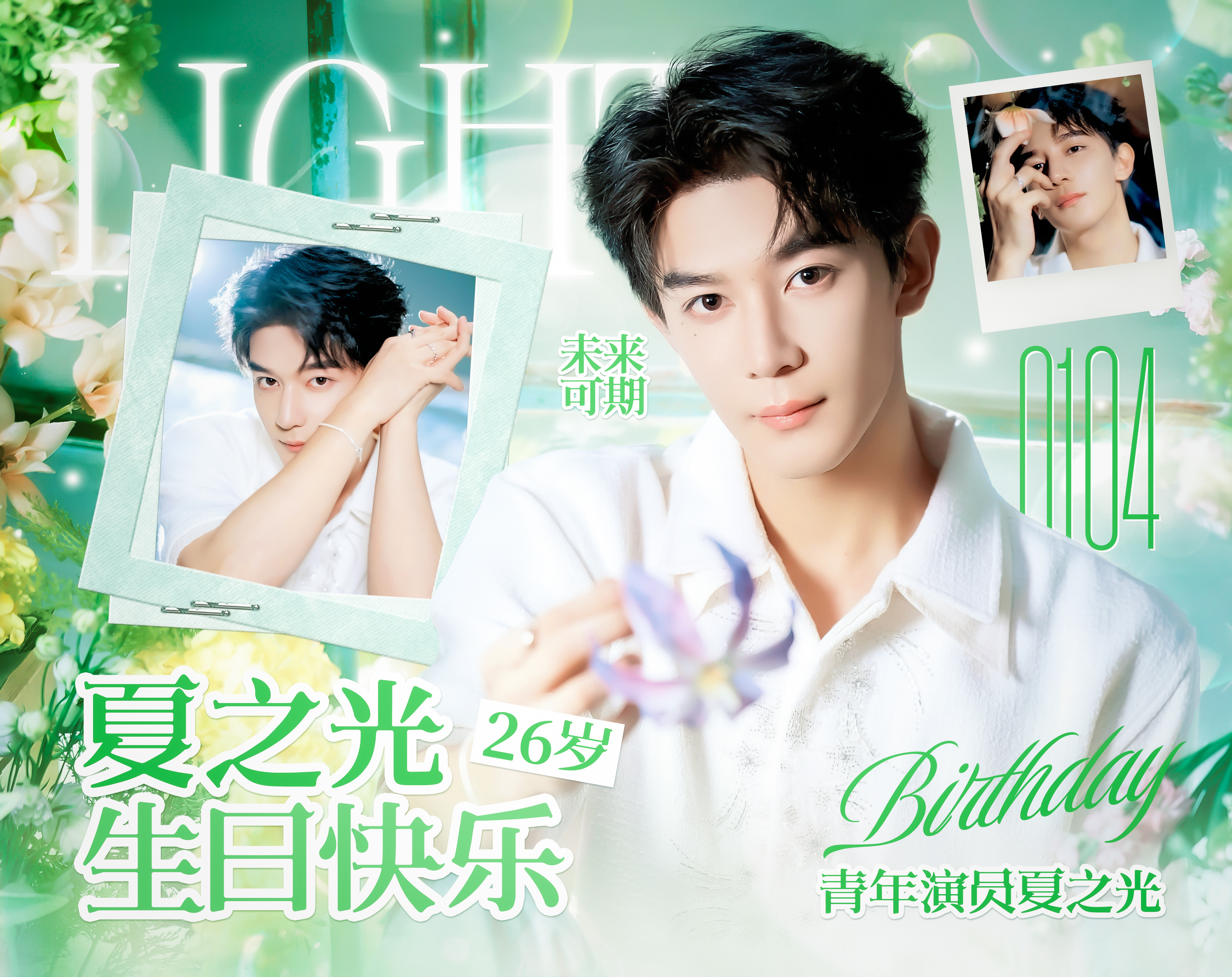 夏之光 舞台上,他是神的孩子在跳舞,传递着神谕的音符。镜头中,他将灵魂血肉借出,演绎着百样人生悲欢喜怒。祝26岁的生日快乐!新的一岁,继续熠熠生辉!夏之光0104生日快乐夏之光廿六旭日升,雪融放春伴君胜