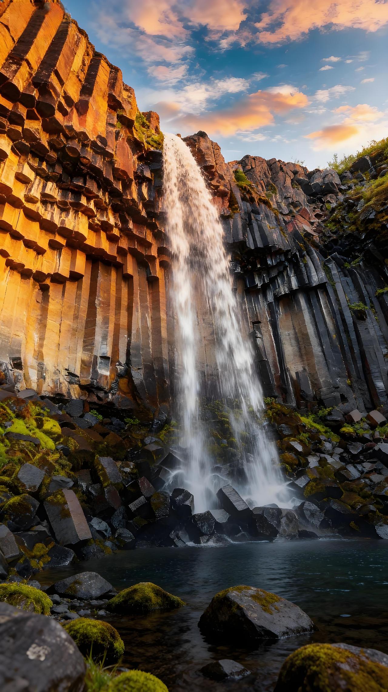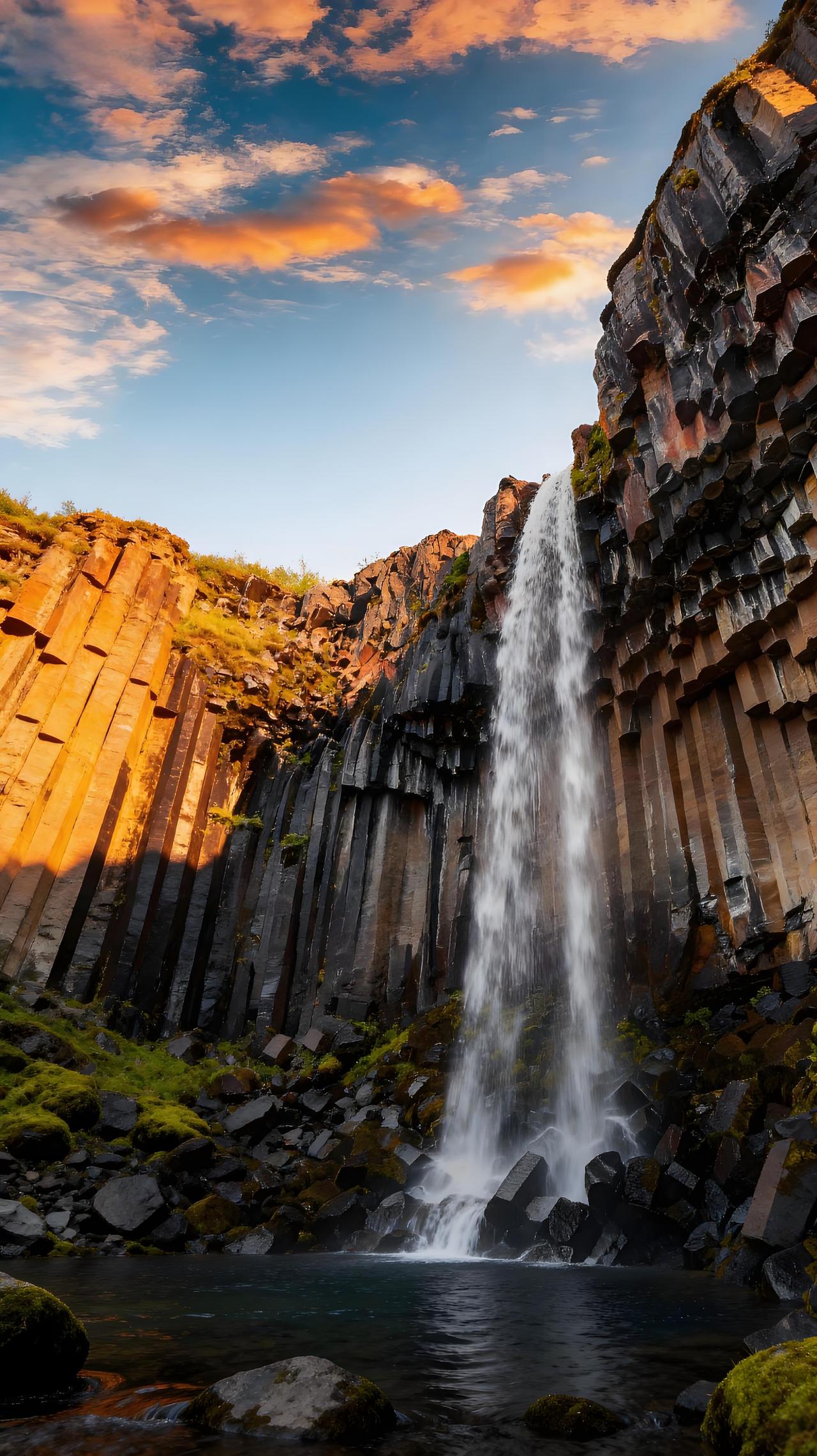 斯瓦蒂佛斯瀑布是柱状玄武岩结构,落差约12米,水流从深色六边形玄武岩柱构成的悬崖上倾泻而下,刚硬岩石与柔顺流水,黑白分明,形成鲜明对比,赋予了瀑布一种“暗黑系"独特美学气质,称为黑瀑布。誉为世界十大最美瀑布及地貌奇观之一。 美景 黑瀑布 雪山美景 世界奇观