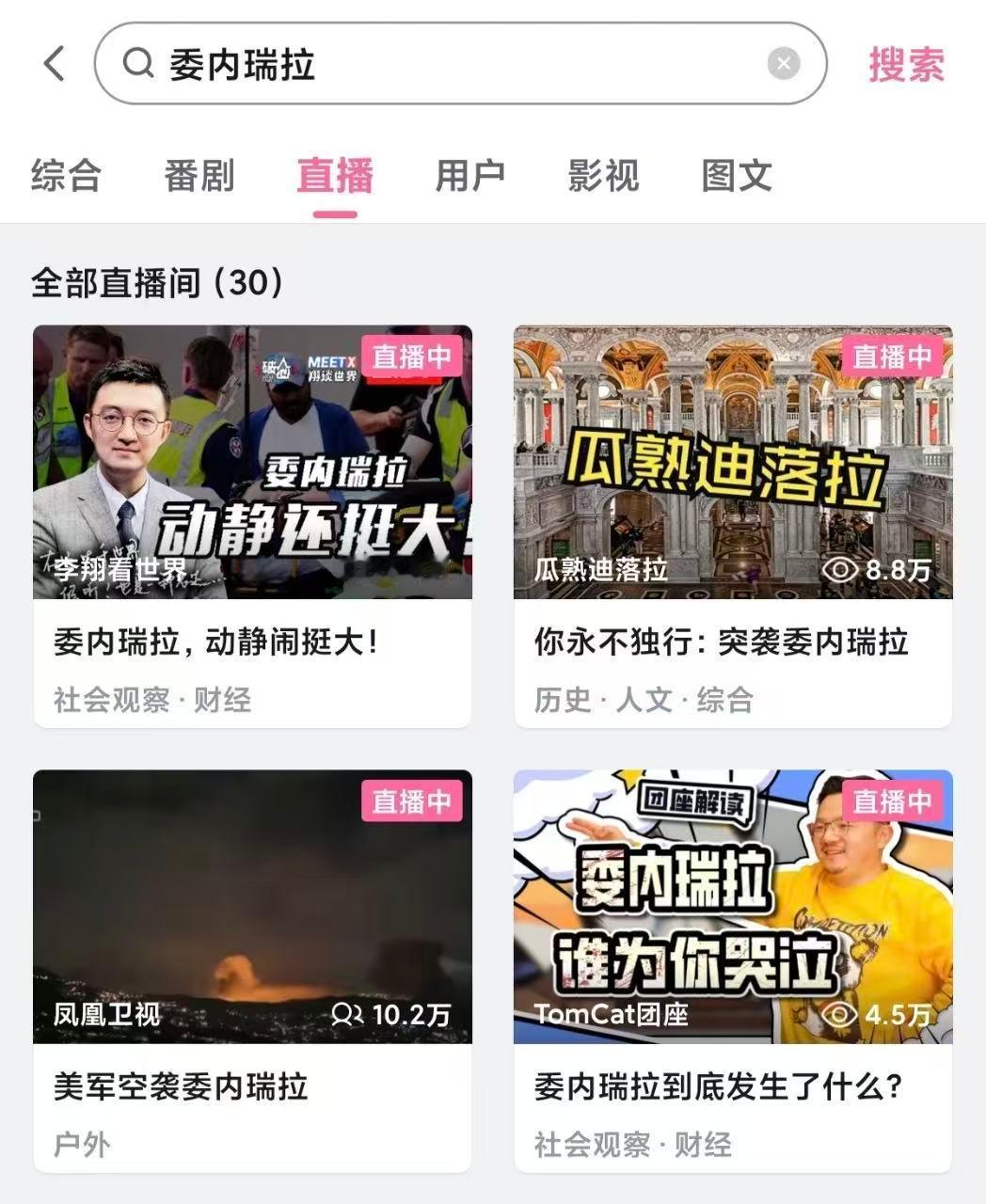 特朗普称已抓获委内瑞拉总统 委内瑞拉事件爆发到现在,B站几个平时很有输出的UP主已经开始直播了,汇总了下,兄弟们可以去关注下 观察者网军工组✖️沈逸(复旦大学教授,《逸语道破》主讲人、bilibili 2020百大UP主)直播内容:解析美军突袭委内瑞拉原因 回放链接:网页链接2. 李翔✖️白孟宸(知名军事历史研究专家,军事评论员,专注于军事,国际领域分析,观点常被主流媒体引用)直播内容:美军突袭委内瑞拉实时内容追踪分析直播链接:网页链接 3. TomCat团座:bilibili 知名UP主,硬核军事历史主播,深度分析与解读国际时政直播内容:委内瑞拉总统马杜罗被俘的过程及生平介绍直播链接:网页链接4. 瓜熟迪落拉(bilibili 知名科普UP主,擅长美国研究和社会观察科普)x红色幻想乡B号机形态(bilbili知名UP主,专注讲述全球各国军事内容)直播内容:美国发起委内瑞拉特别行动的战略技术和全球影响直播链接:网页链接5. 双尾彗星:bilibili 知名游戏UP主、直播高能主播直播内容:特朗普发布会重点内容分析直播链接: 网页链接