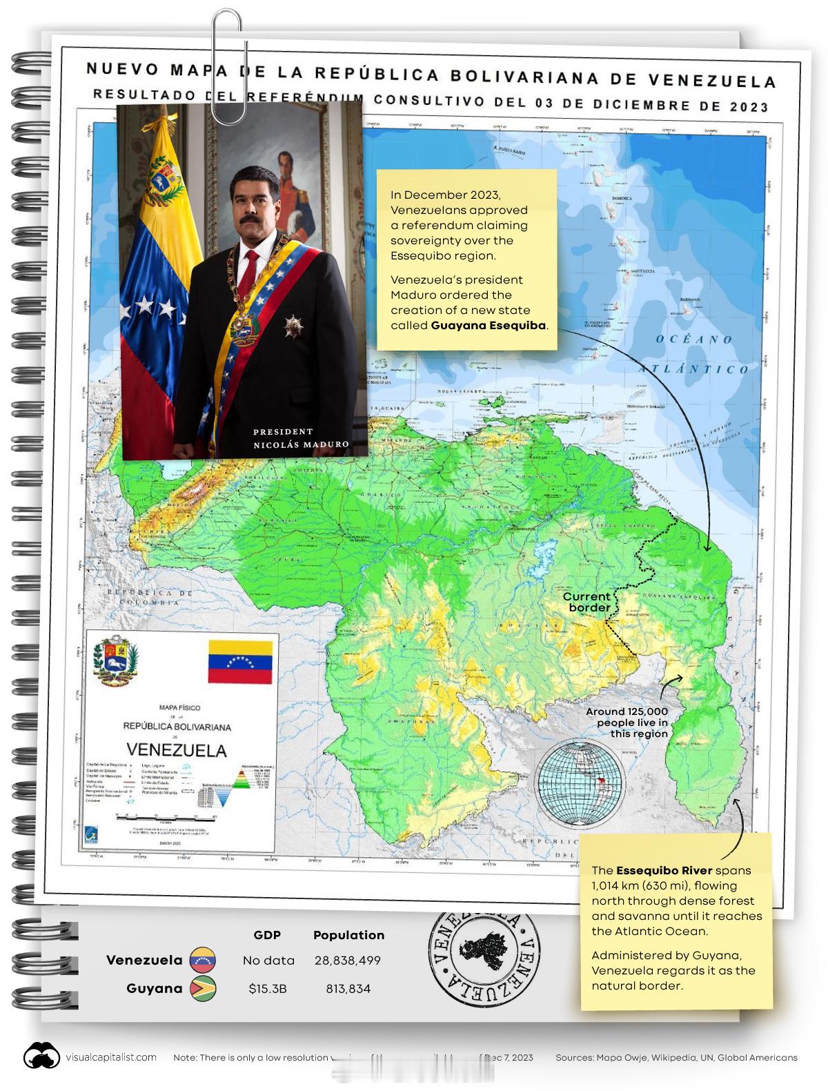 图1:美国对拉美的军事干预史图2:世界各国已探明的石油储量排名(大差不差各渠道口径稍有差异)图3:委内瑞拉的人口分布图4:委内瑞拉的森林覆盖图5:委内瑞拉曾在2023年底的全民公投中,以95%支持票通过占英属圭亚那三分之二领土的埃塞奎博地区属于委内瑞拉。2024年马杜罗政府宣布埃塞奎博地区为委内瑞拉组成部分。图6:被美军劫持的委内瑞拉总统尼古拉斯·马杜罗·莫罗斯照片中穿着一身耐克 Nike Tech,未知是他自己的还是美军带过去的。委内瑞拉是中国重要的石油贸易伙伴。委内瑞拉马杜罗夜间被抓细节披露巴西承认罗德里格斯为委领导人