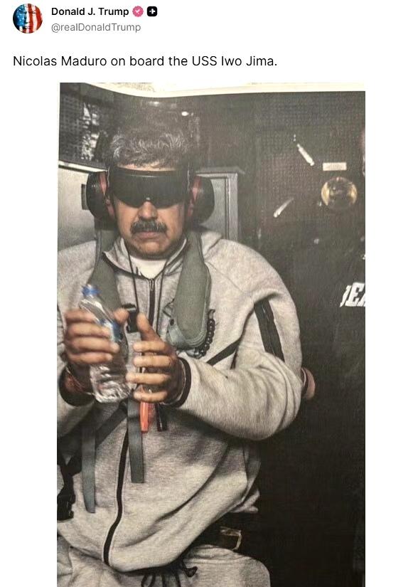 特朗普公布照片:马杜罗目前在美国军舰“硫磺岛”号上 照片中他身穿耐克灰色运动套装,网友热评耐克才是真正的赢家