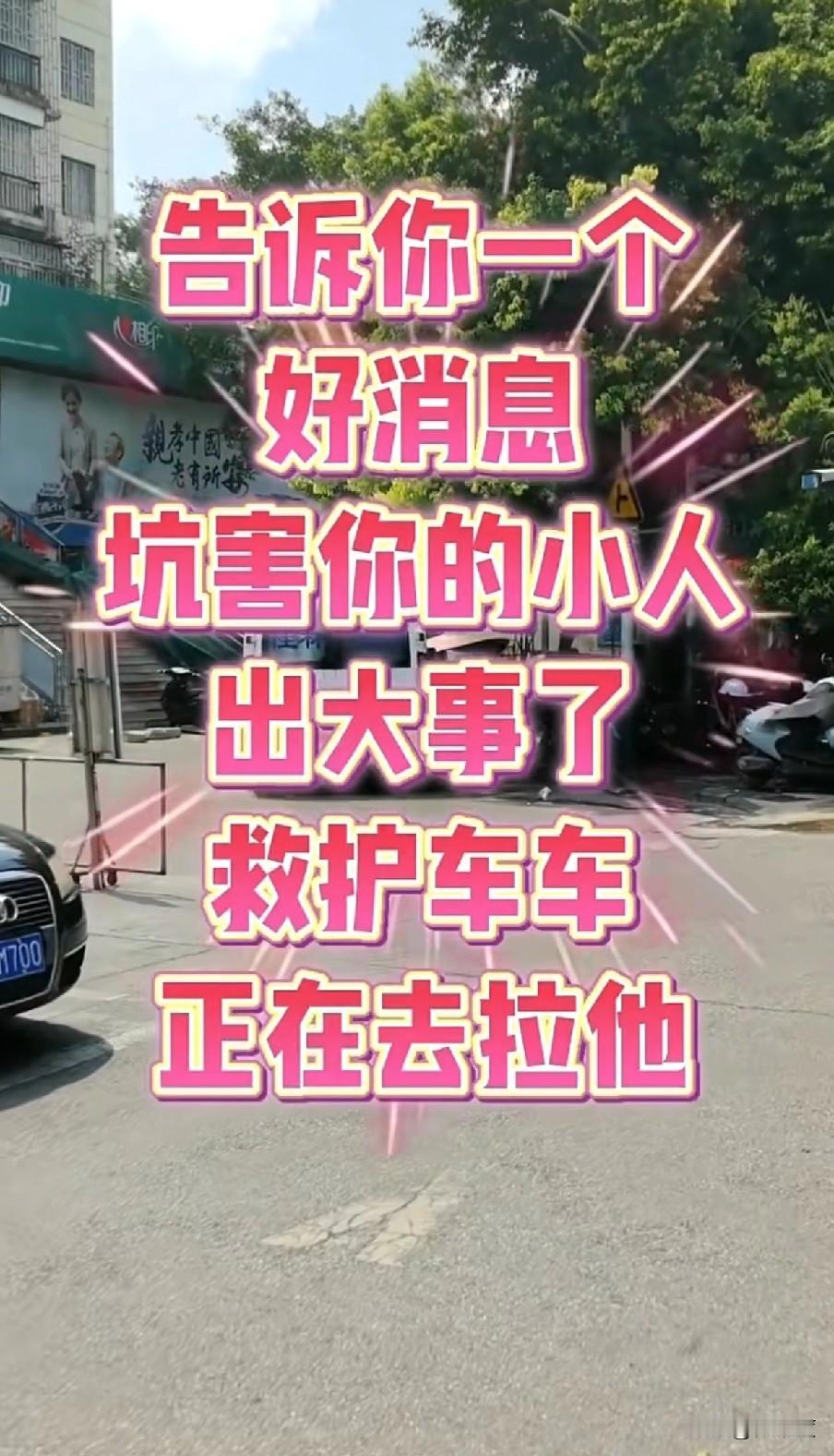 告诉你一个好消息。坑害你的小人。出大事啦,被医院救护车拉走了。 你身边那个丧良心的小人?他不清楚自己不是个什么东西。他违背了自己的良心,去坑你,去害你。他感觉自己很厉害,很了不起。其实呢,他就属于秋后的蚂蚱,蹦跶不了几天了。不是不报,时候未到,时候一到,必有鬼叫。